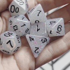 These dice are so nice!! My pictures don't do them justice, but I'm absolutely obsessed with how cloudy and glittery they look, and the hint of green is just too good! Glad I took a chance on the mystery dice - will definitely buy from Dicebound again!