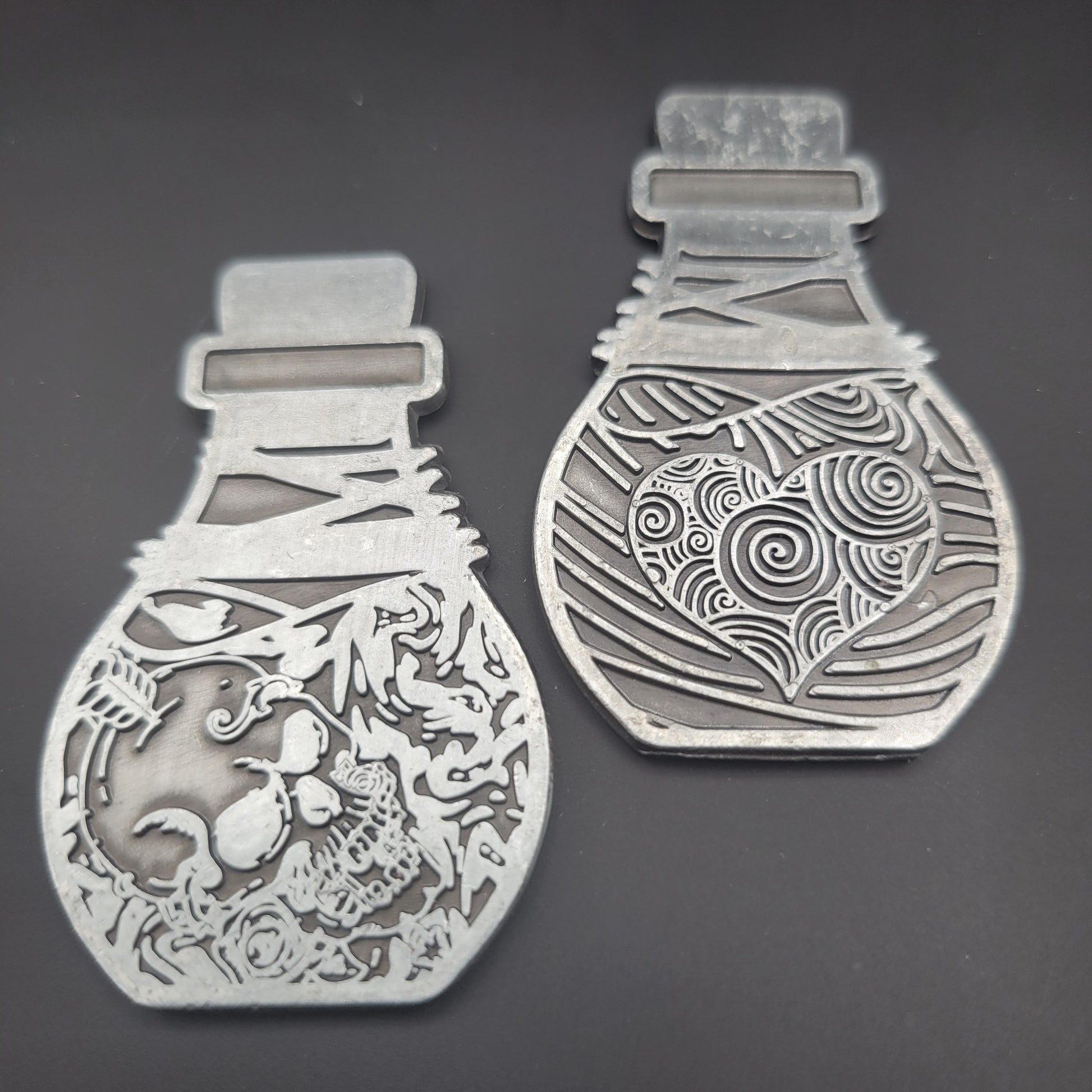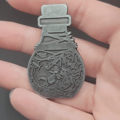 ✦ Shaped like a potion bottle. Featuring a life design on the "heads" side and a death design on the "tails" side! (1.25" x 2")