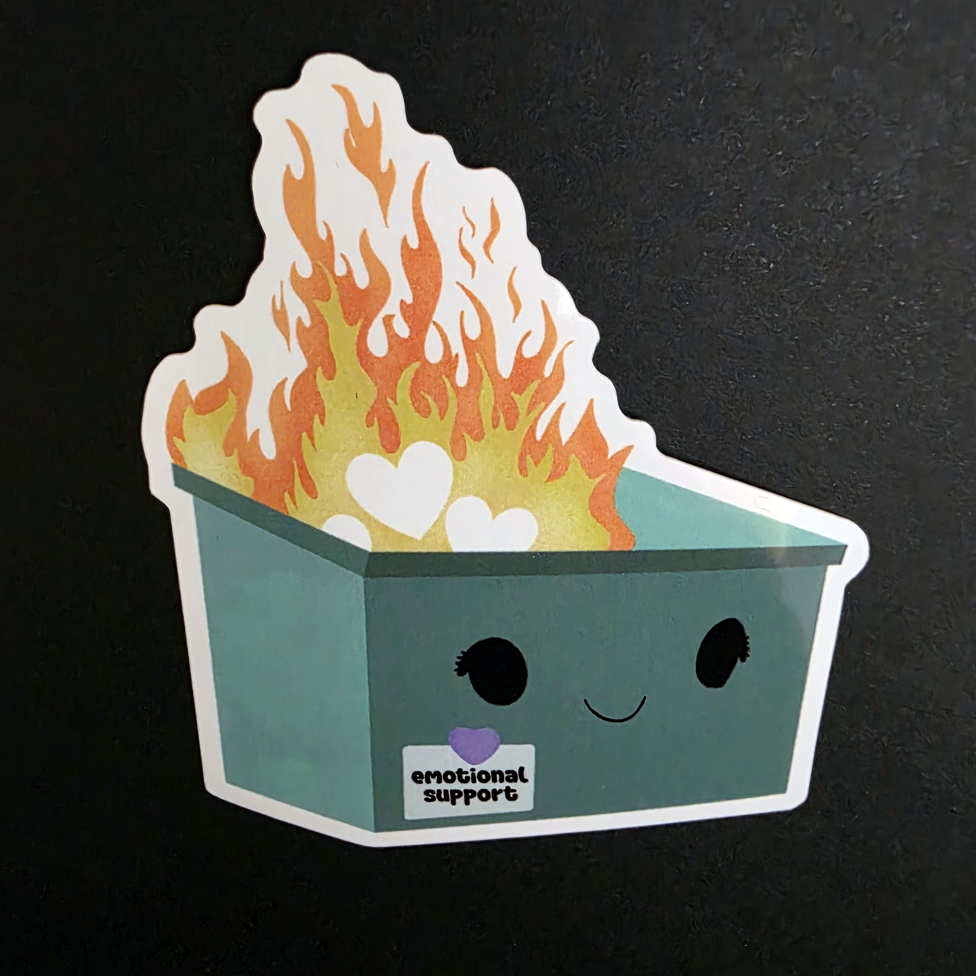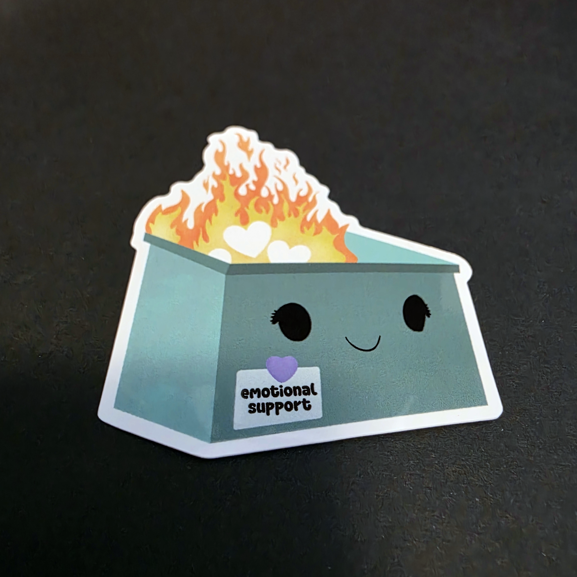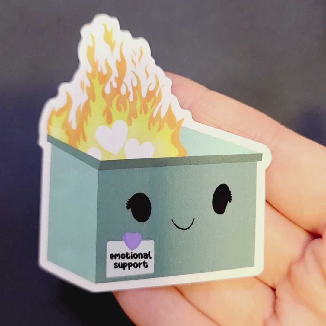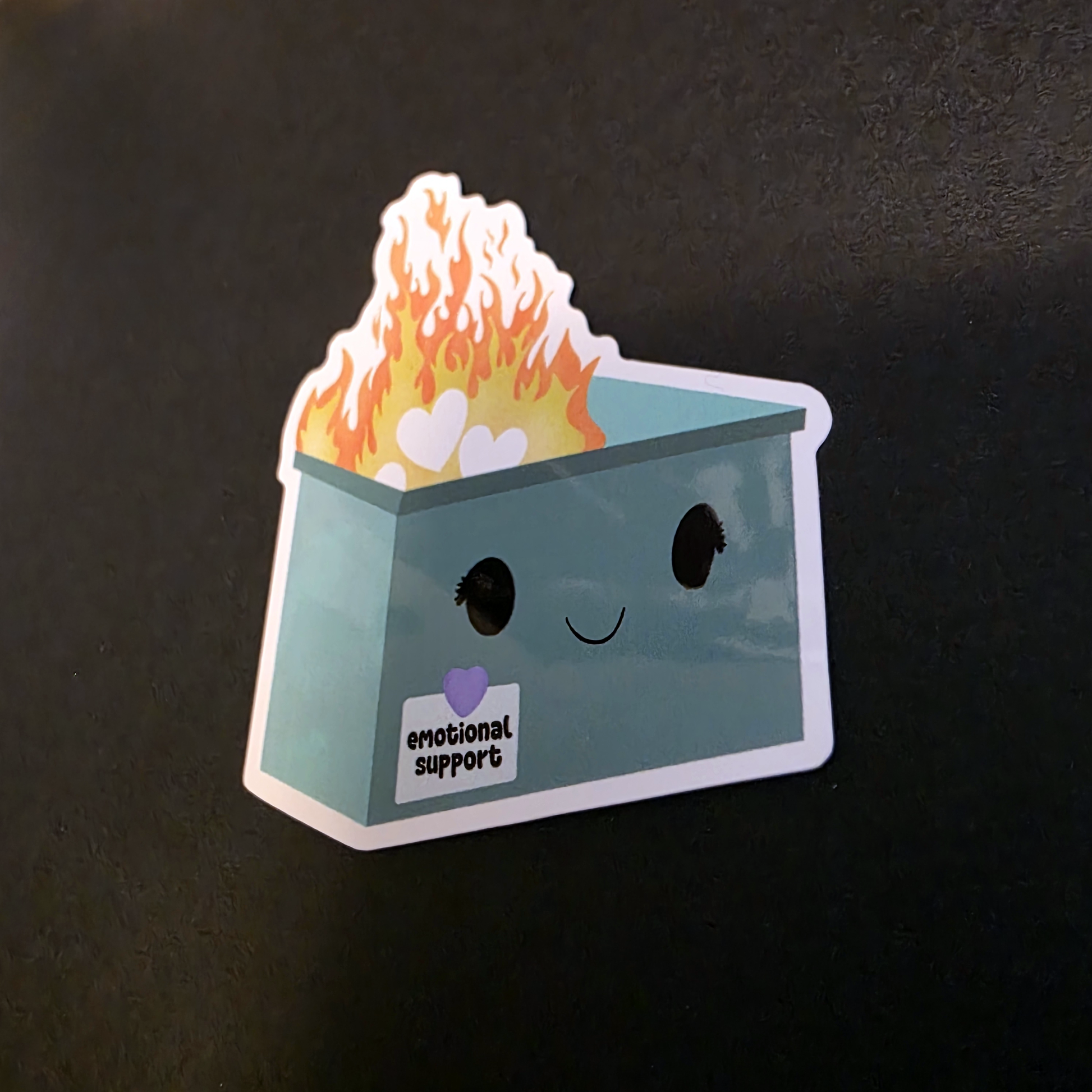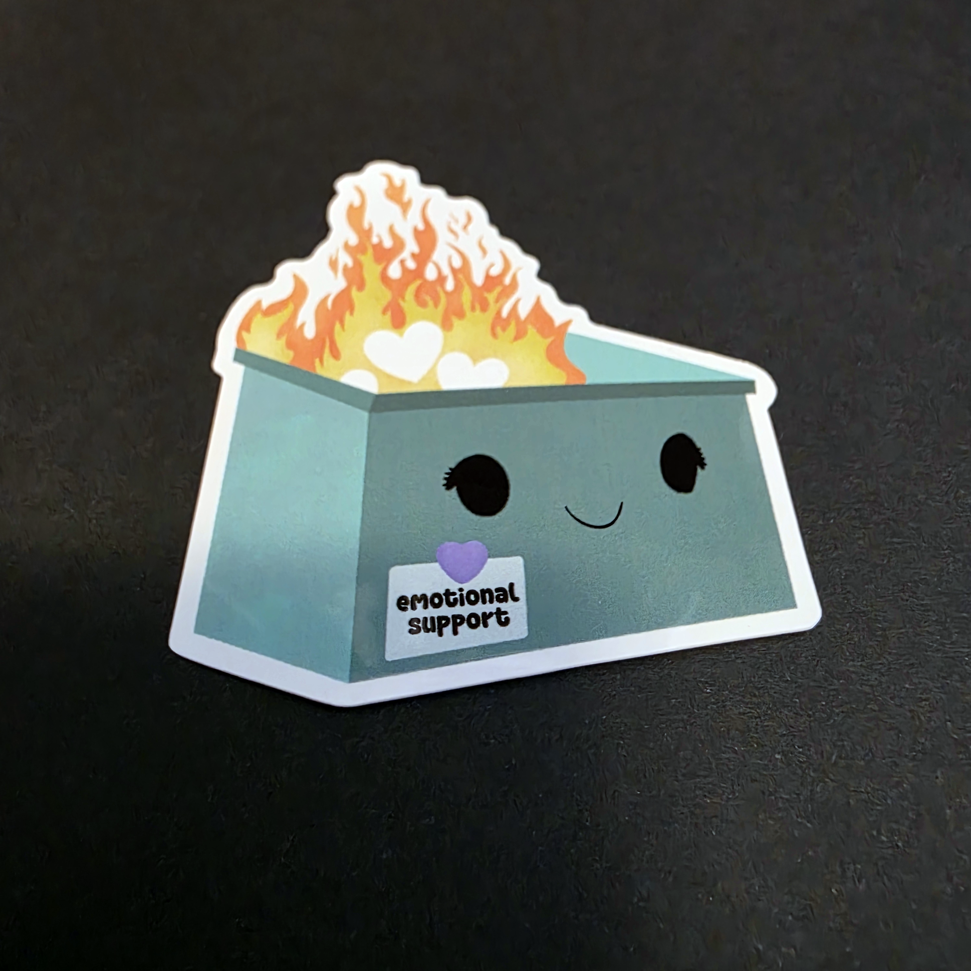 Need a little emotional support? Dumpster fire to the rescue! Adorable and ready to guard your water bottle, laptop, desk, locker or any other surface that needs some love!