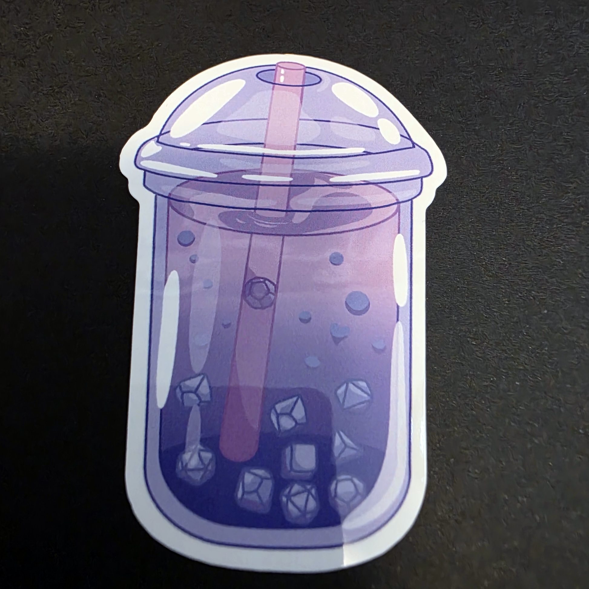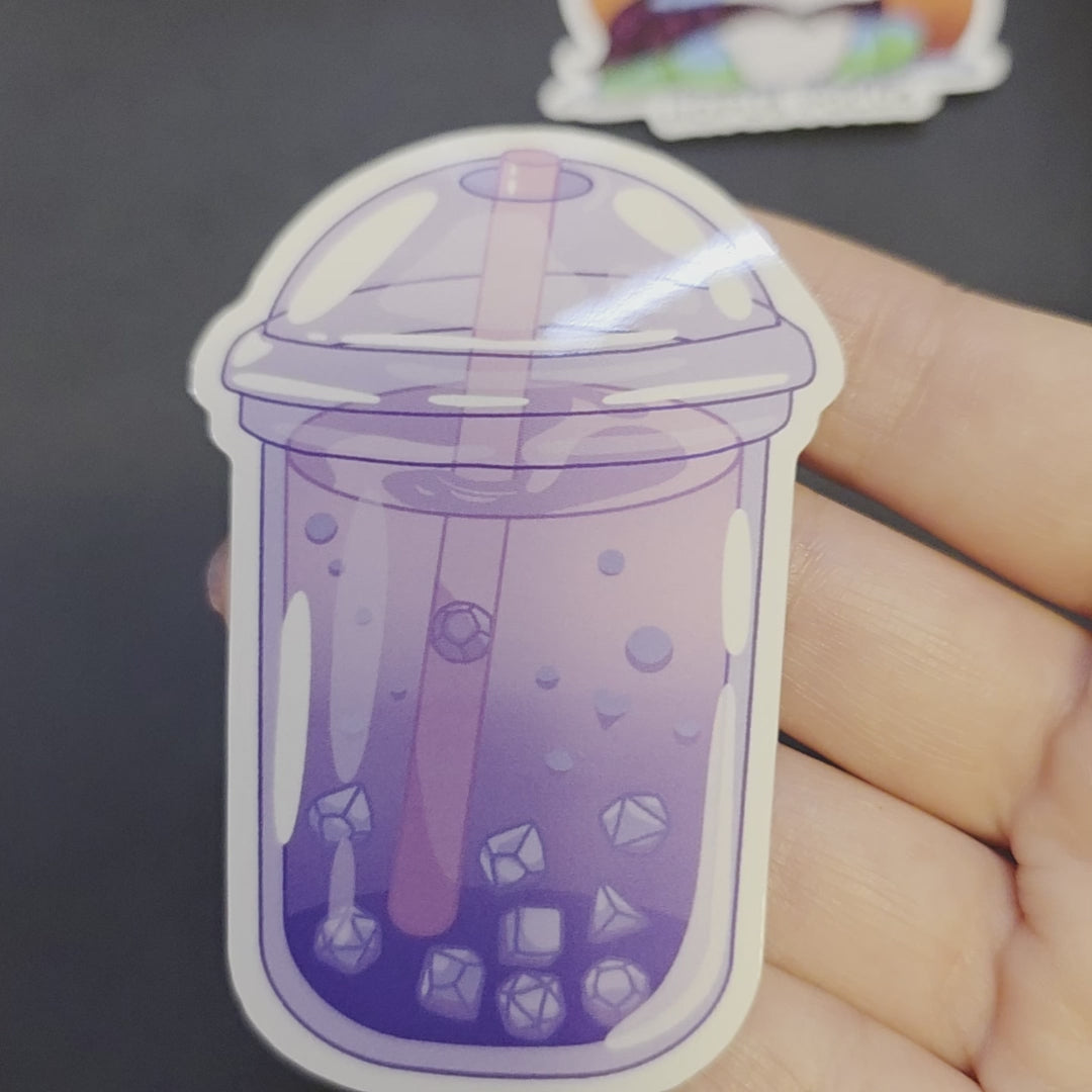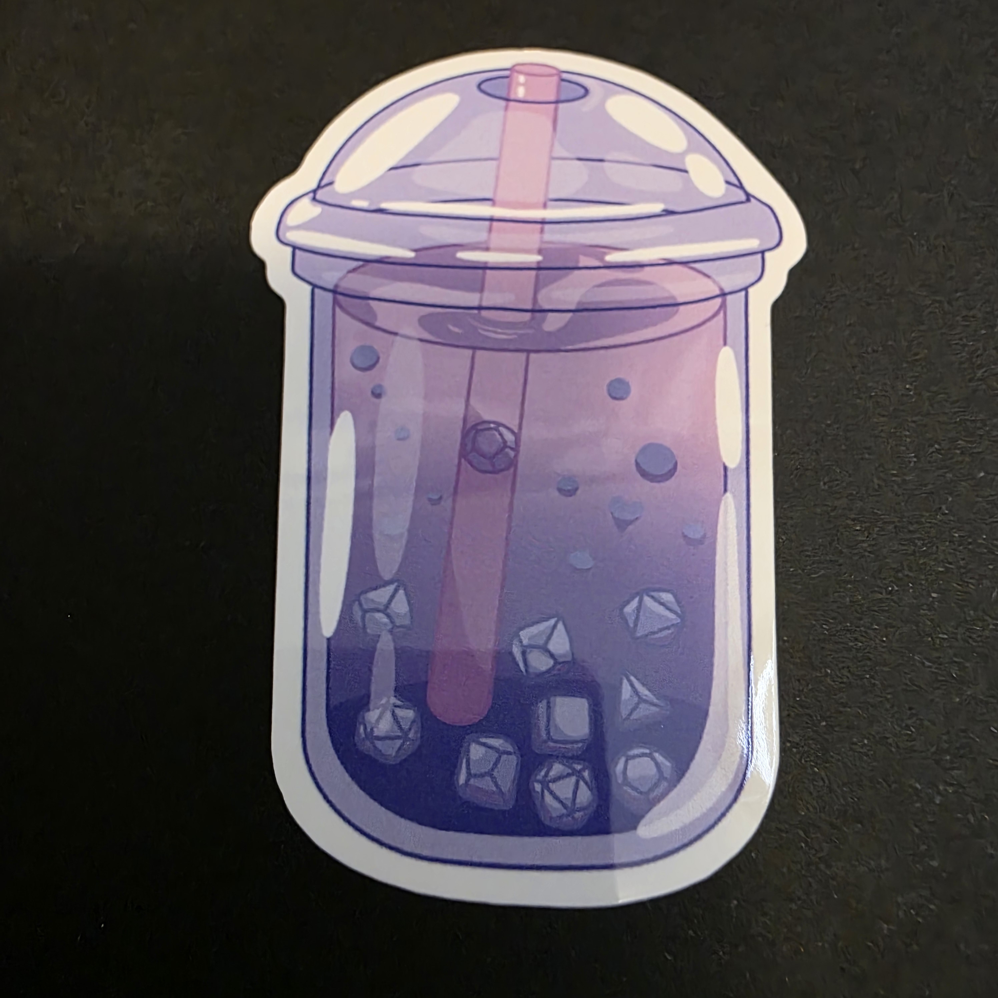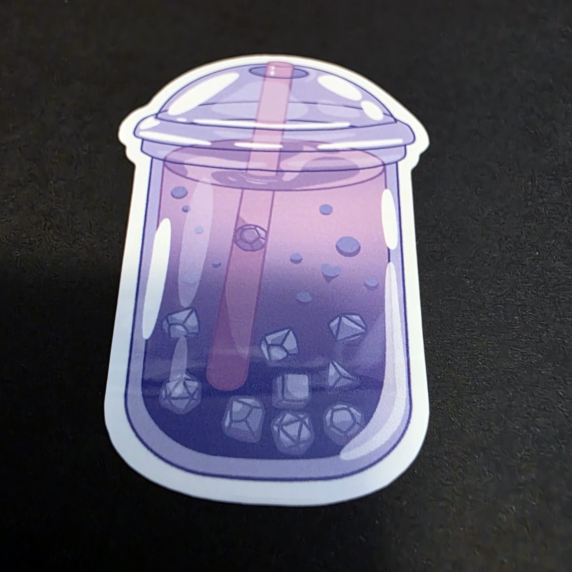 The forbidden boba tea! Filled with refreshing dice, get your vitamin d6, d20, d8, d12, d4, d100 and d10 today! Ready to adorn your water bottle, laptop, desk, locker or any other surface that needs some boba!