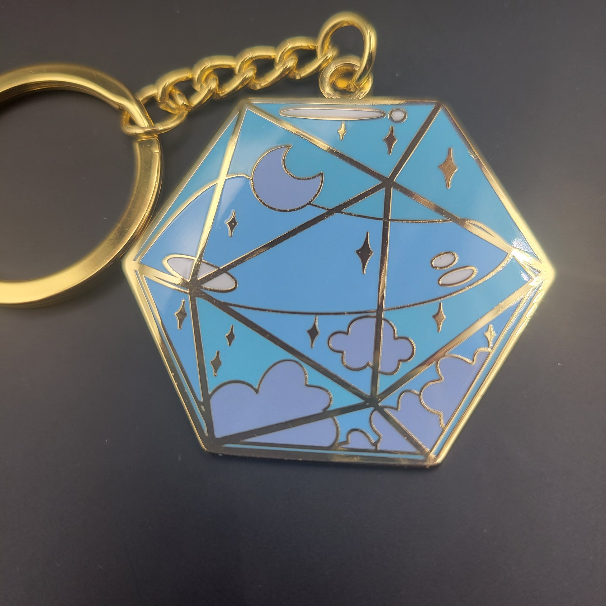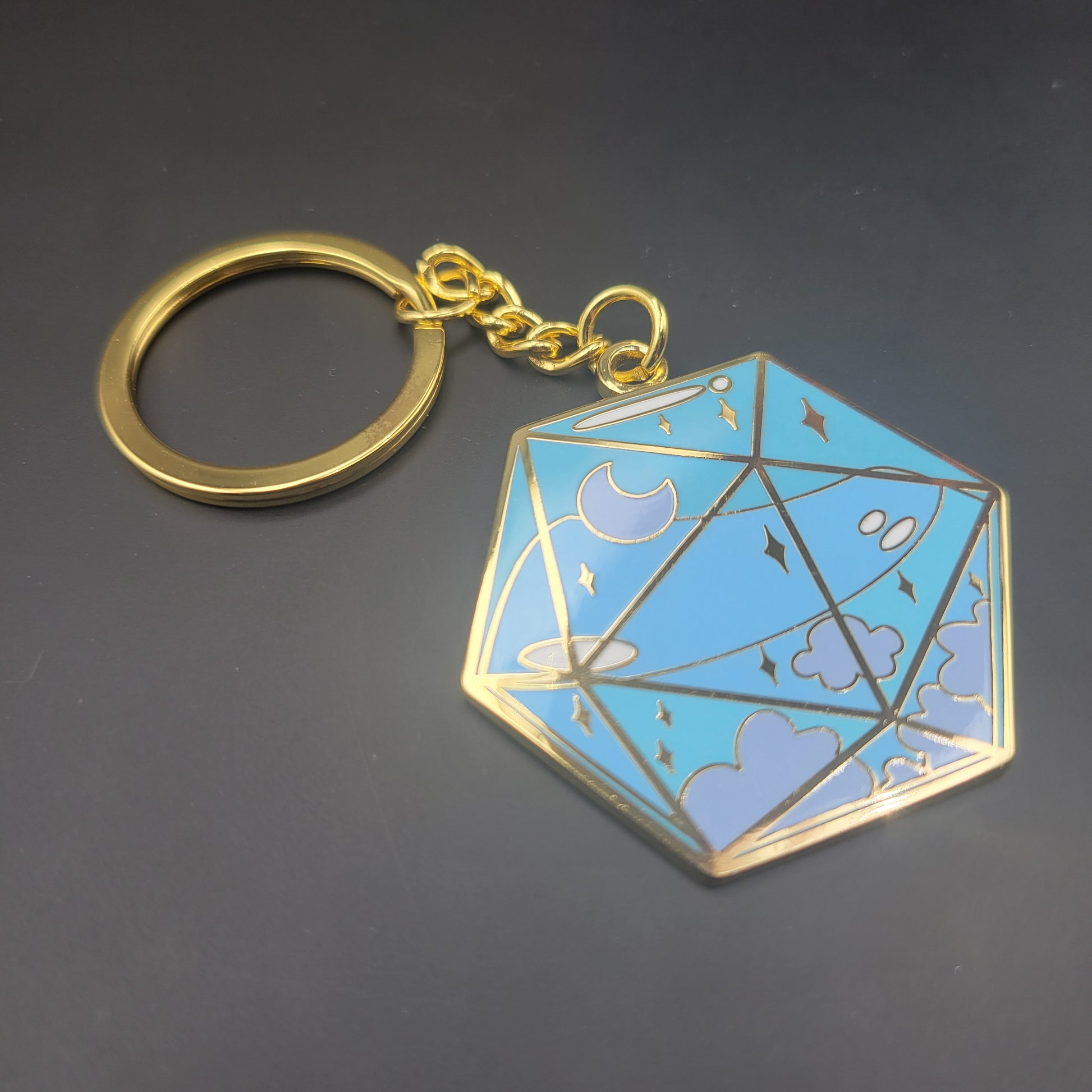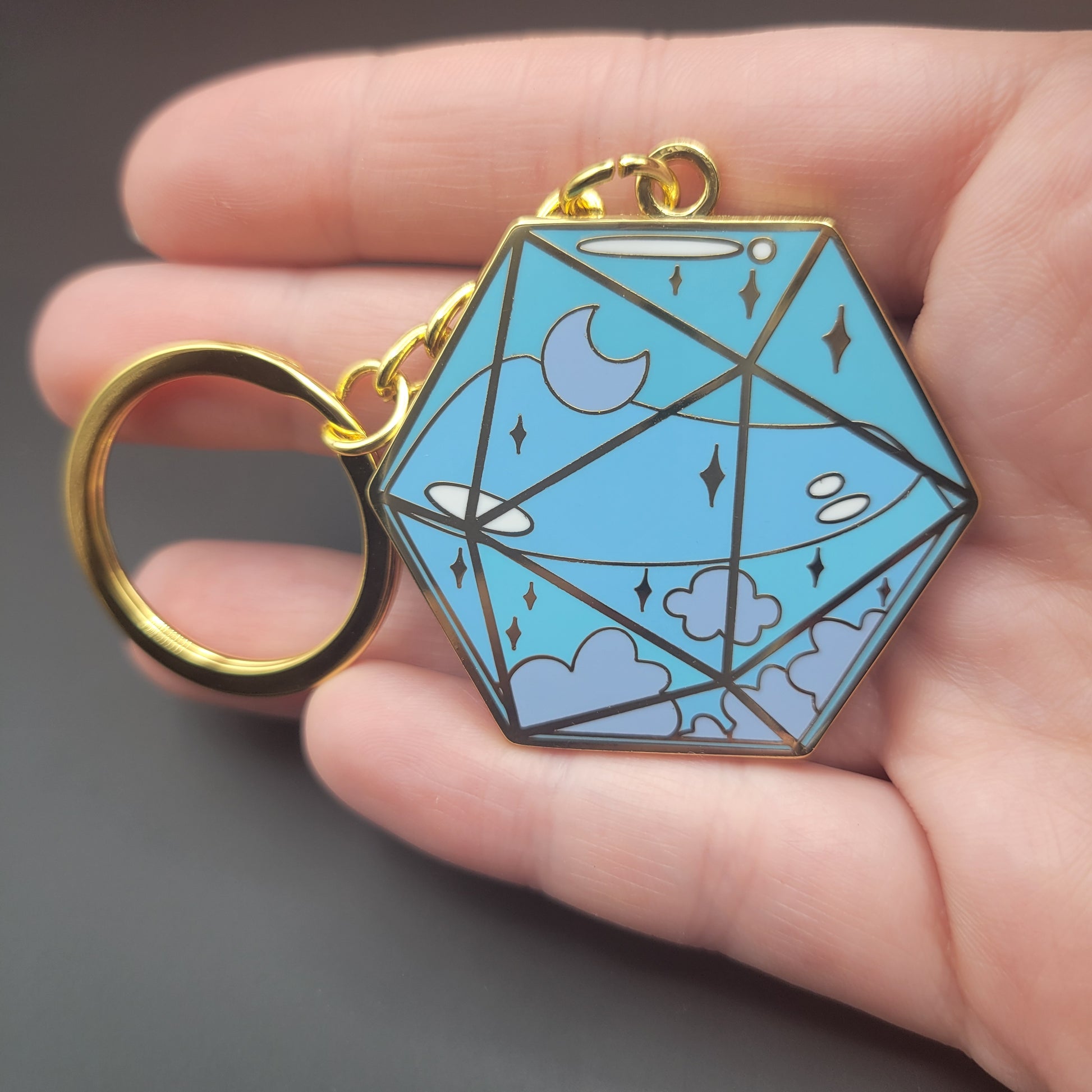 Hard enamel keychain featuring a dreamy D20 imagined as a potion bottle