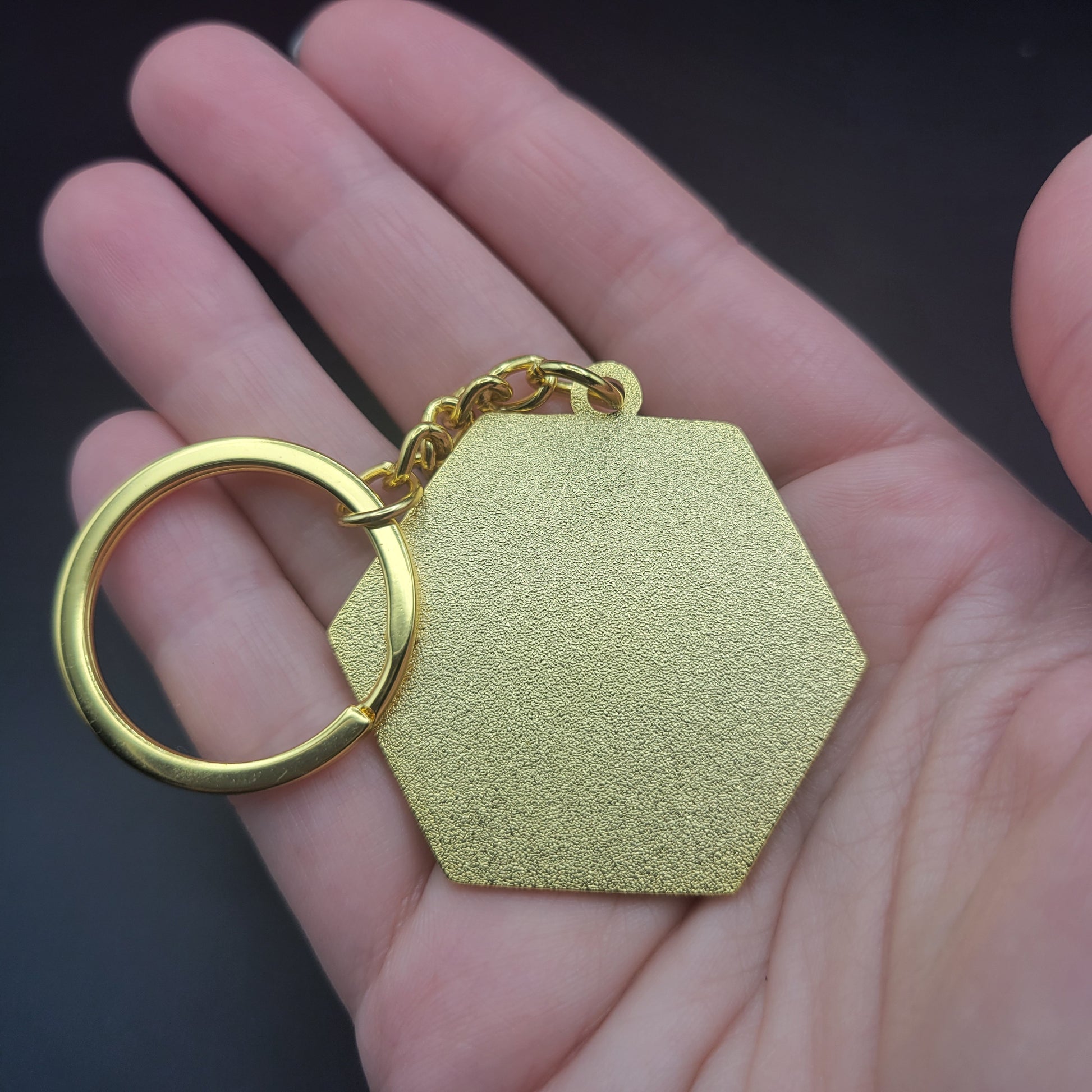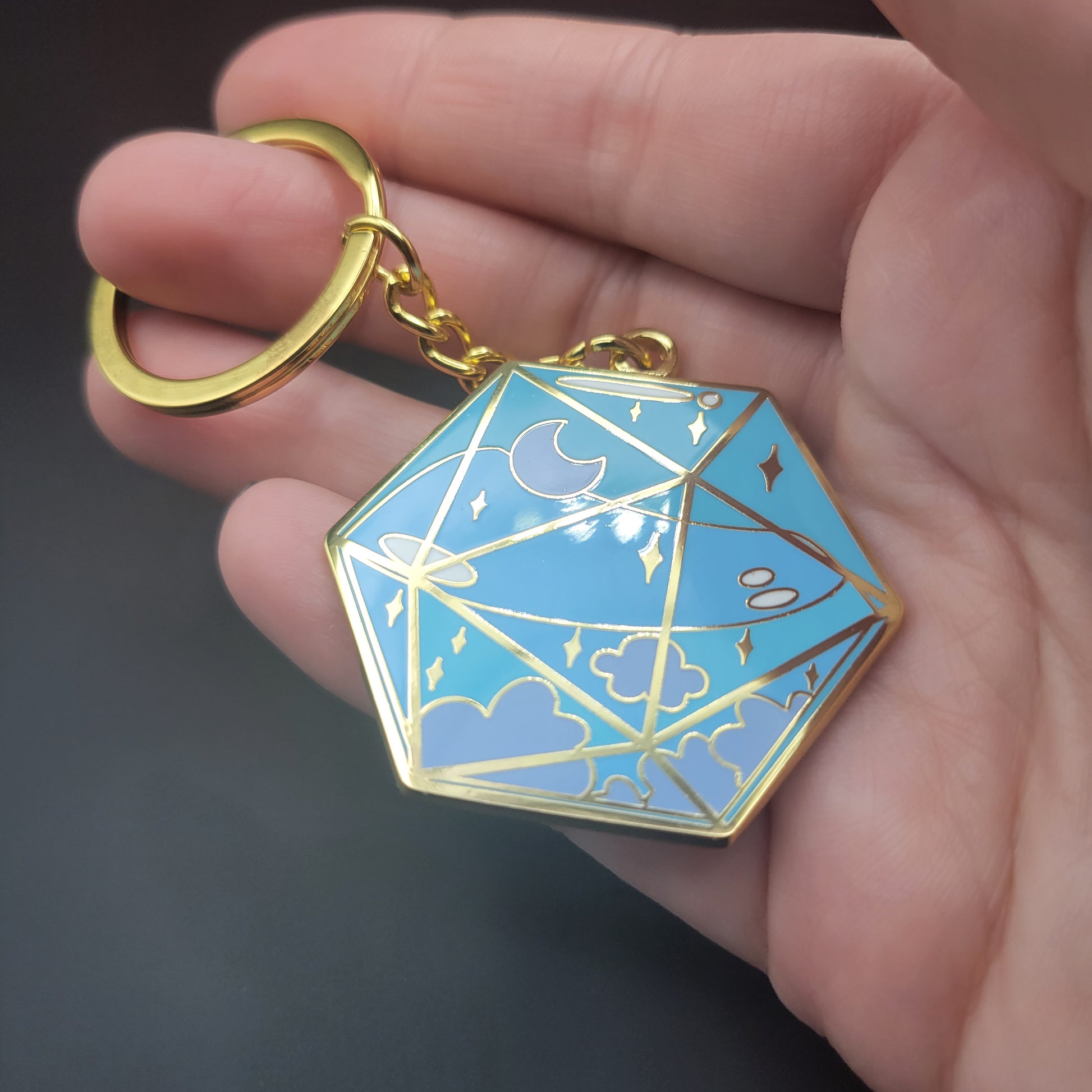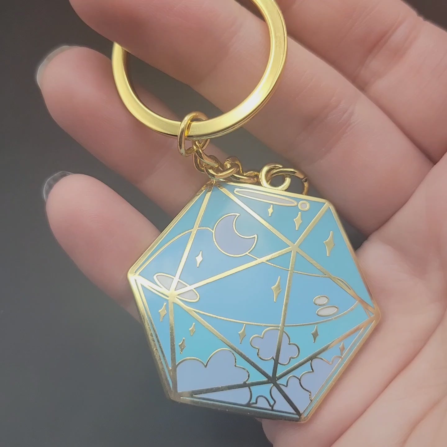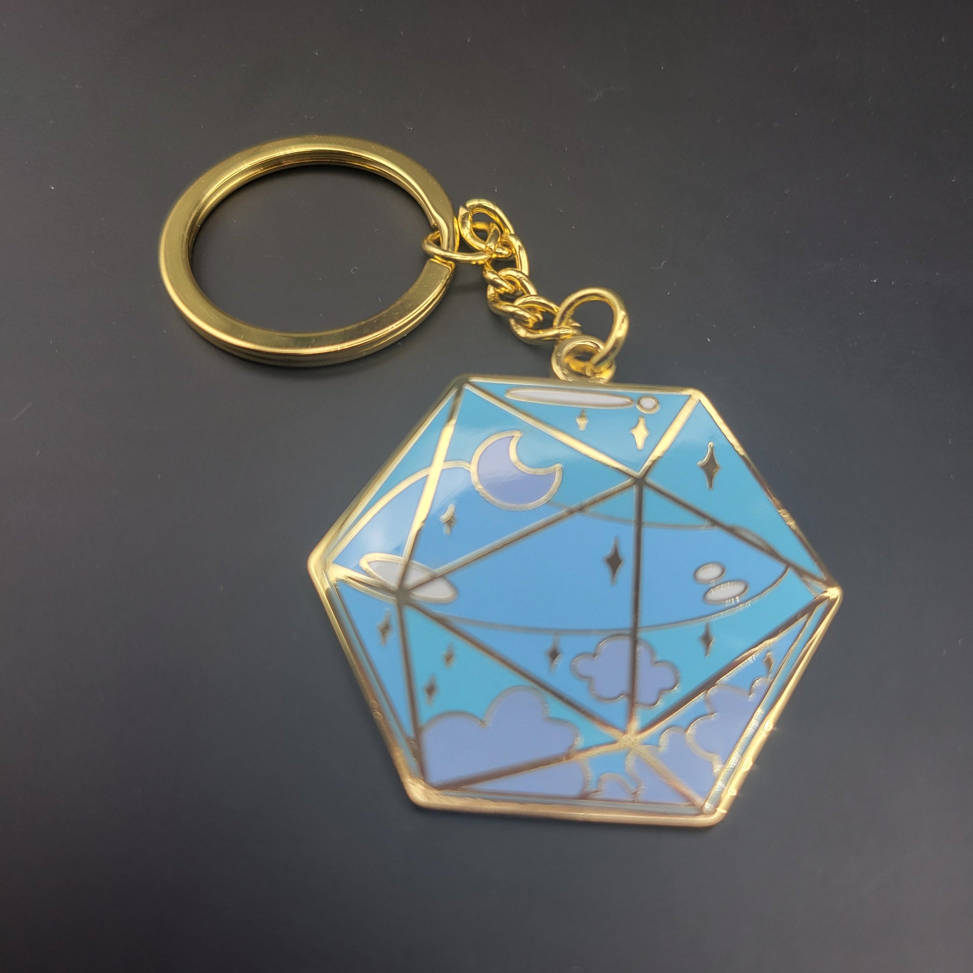Hard enamel keychain featuring a dreamy D20 imagined as a potion bottle