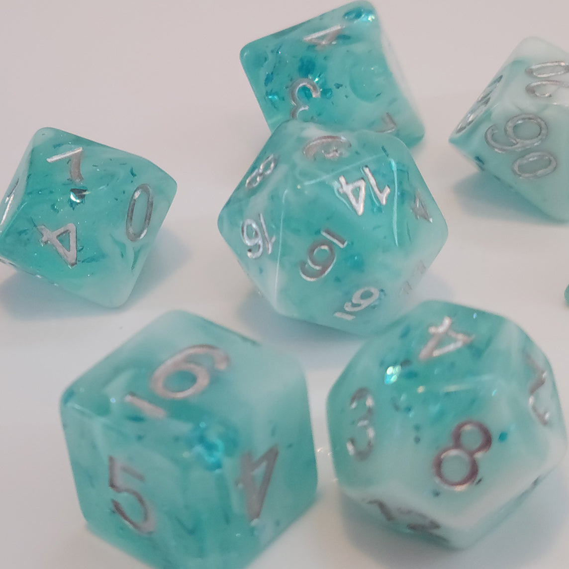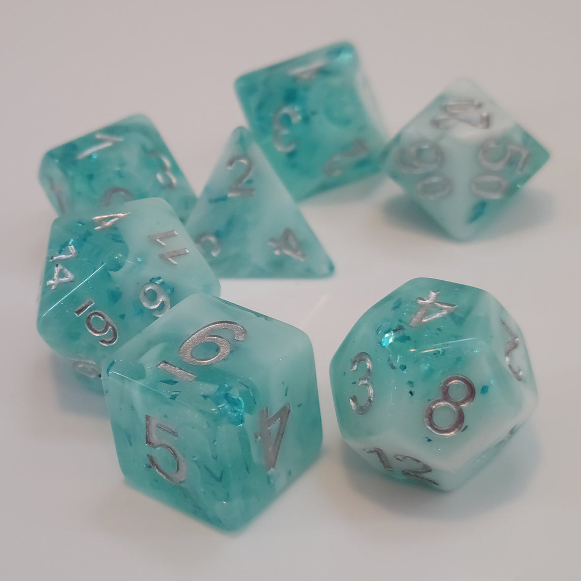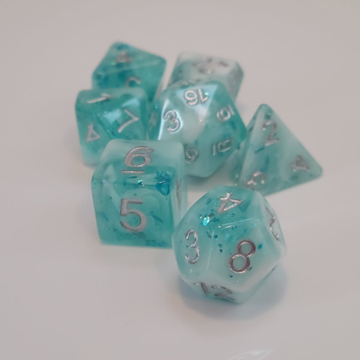 ✦ Frosty, glittery blue resin and foil flakes with swirls of white resin