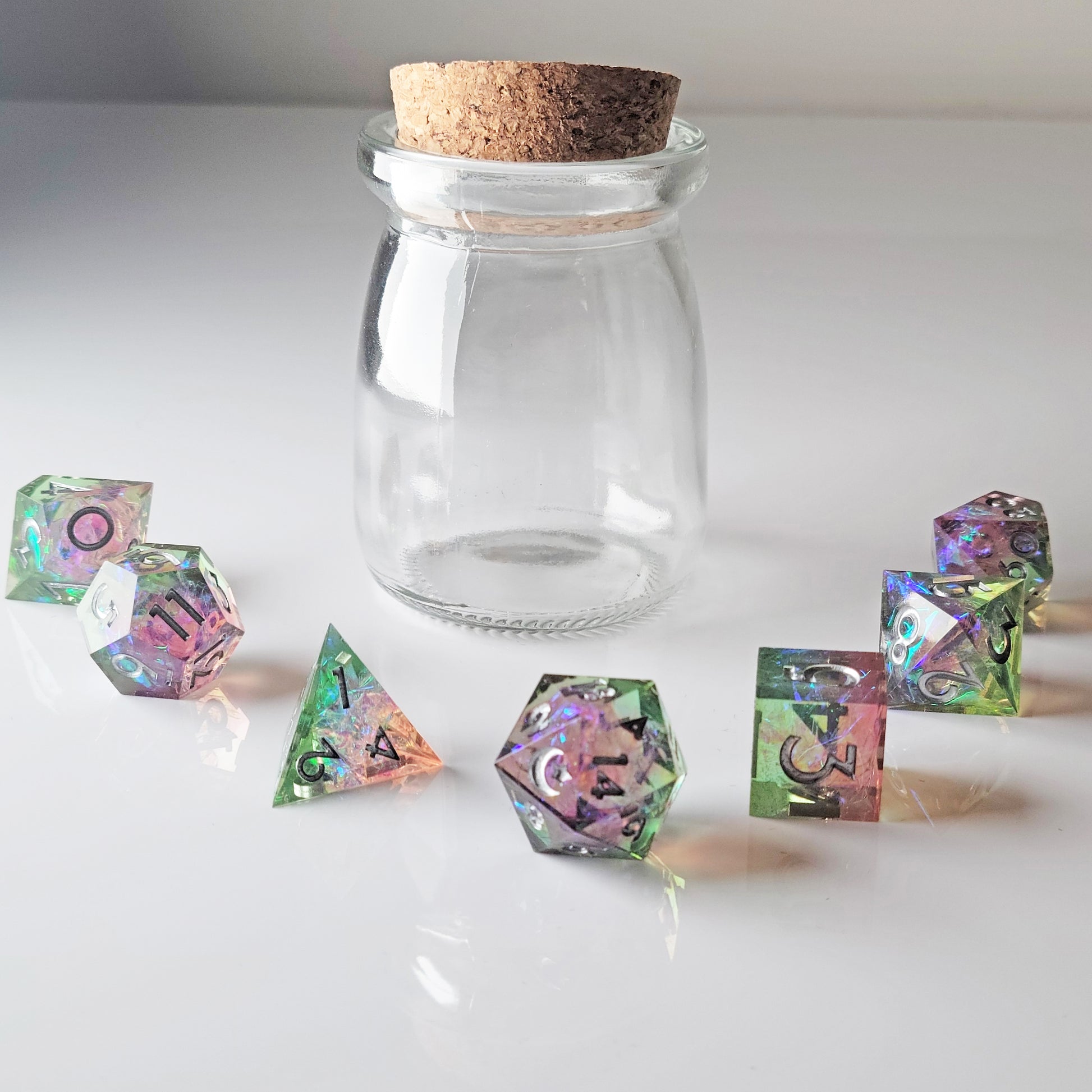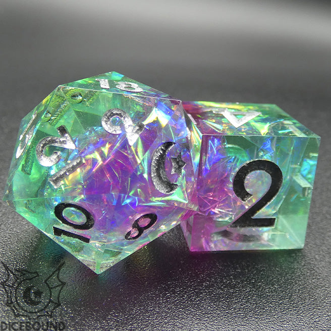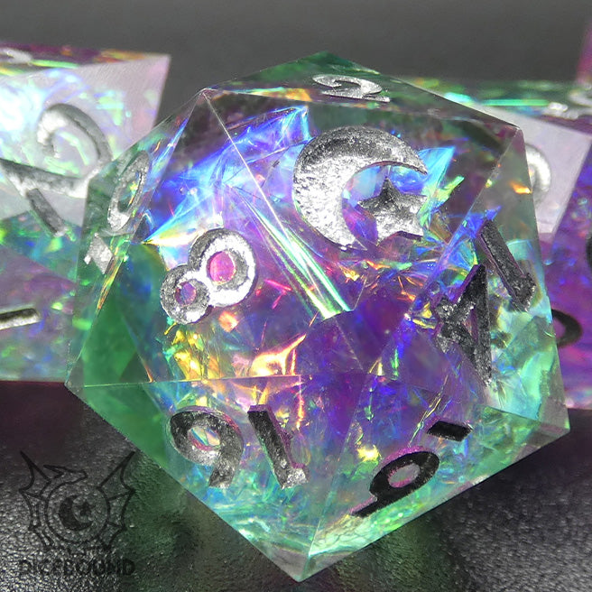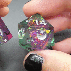 These dice are absolutely beautiful, and for a steal!! I got them and another from this shop because I just couldn’t choose, and it was such a good decision. The moon and star on the 20 are so cute, and they have just the right amount of sparkle. Shipping was excellent, and it came with a sticker of the shop logo :D