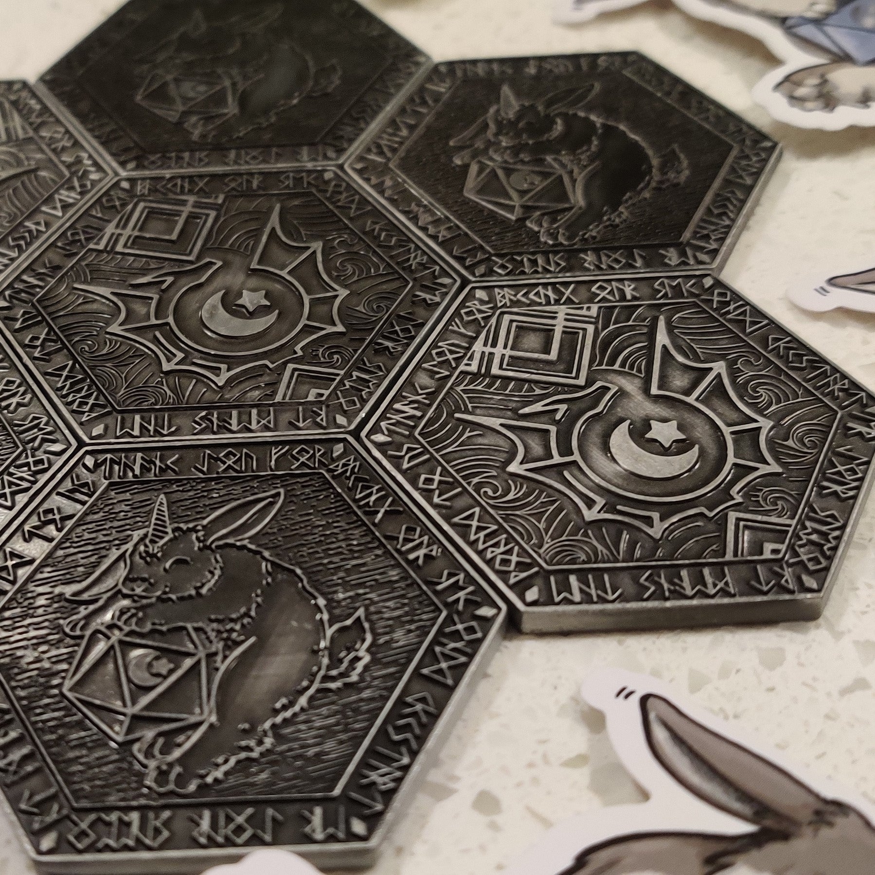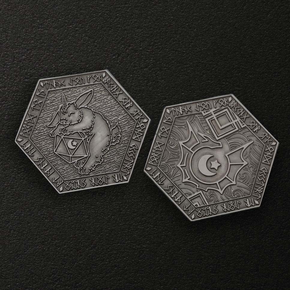 Weathered silver D2 coin. Featuring our logo on the "heads" side and Jellybean the almiraj on the "tails" side!