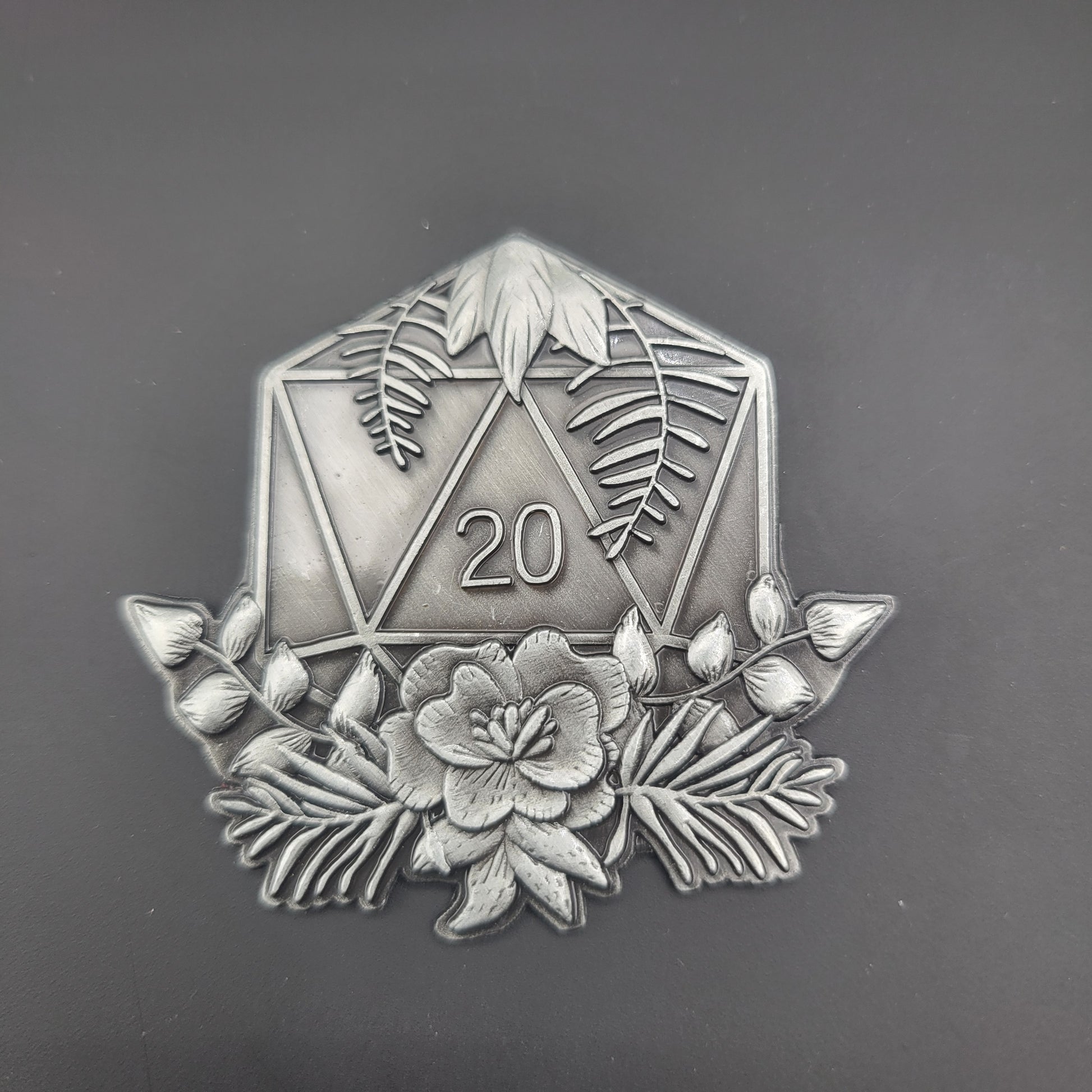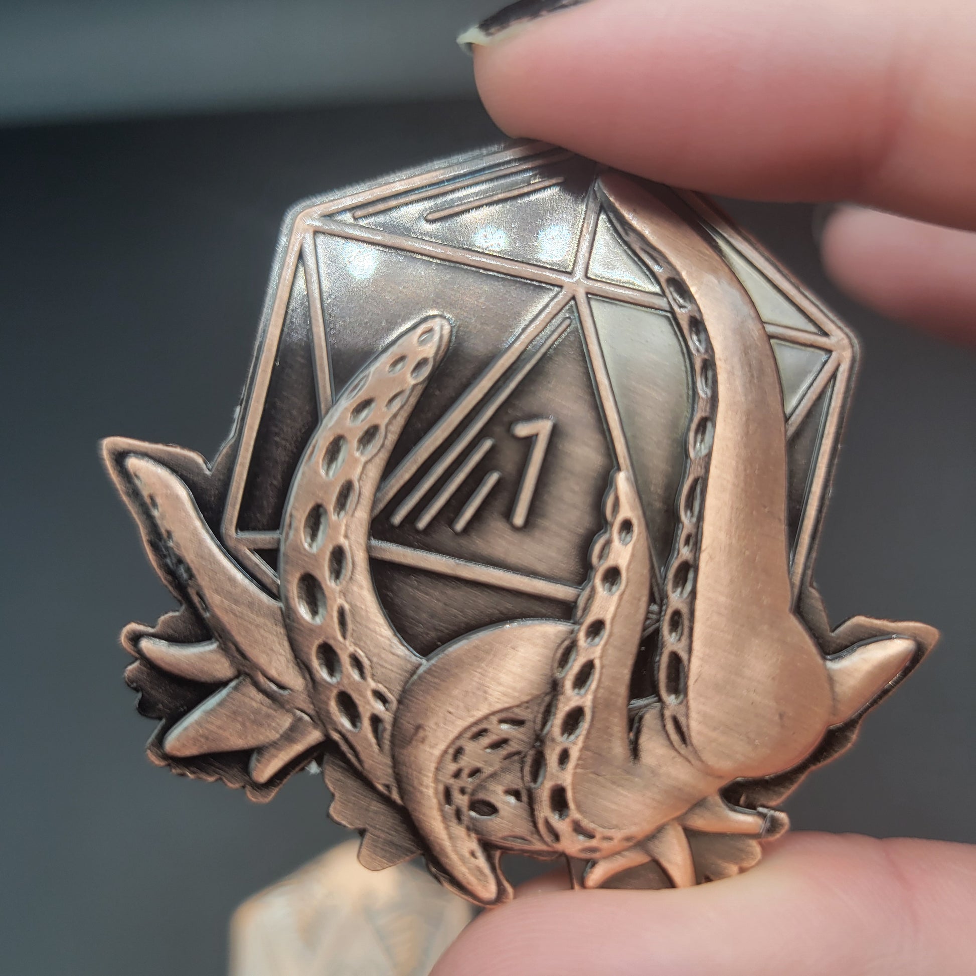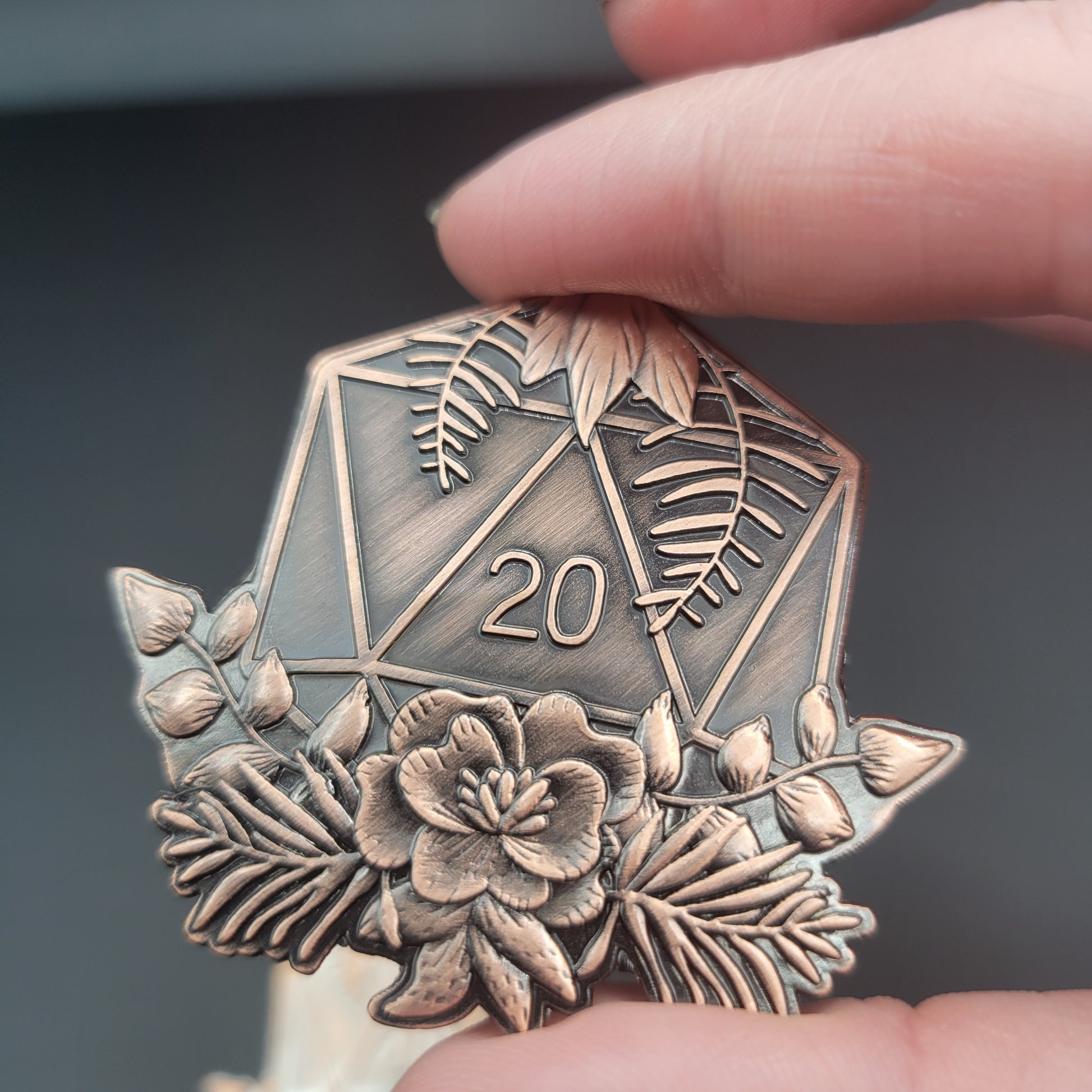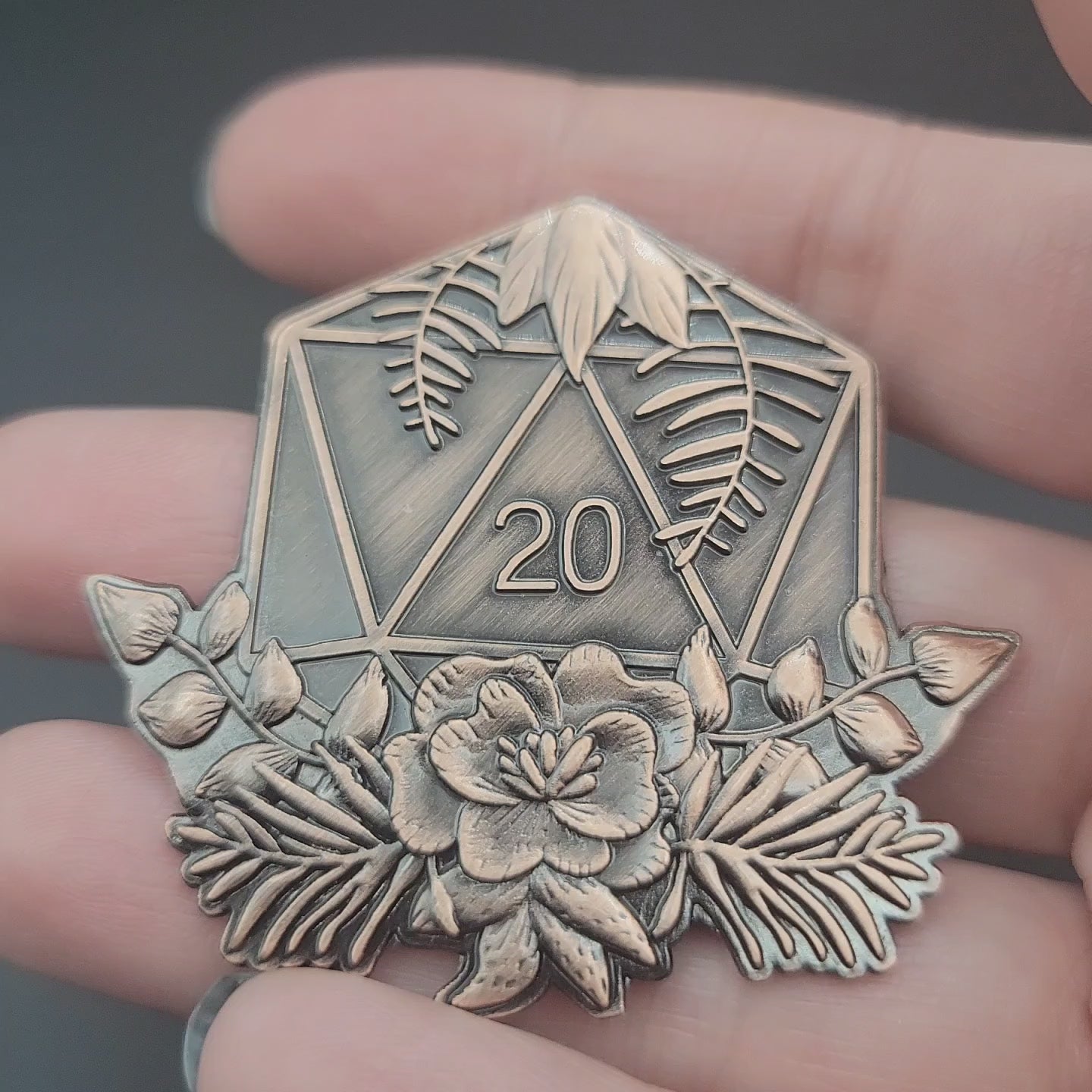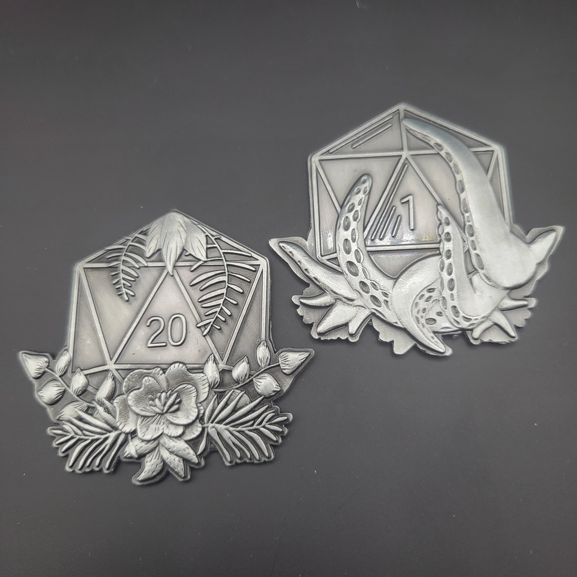 D2 coin Featuring a Floral D20 heads and a Tentacle wrapped D20 tails. Available in an aged bronze or silver look.