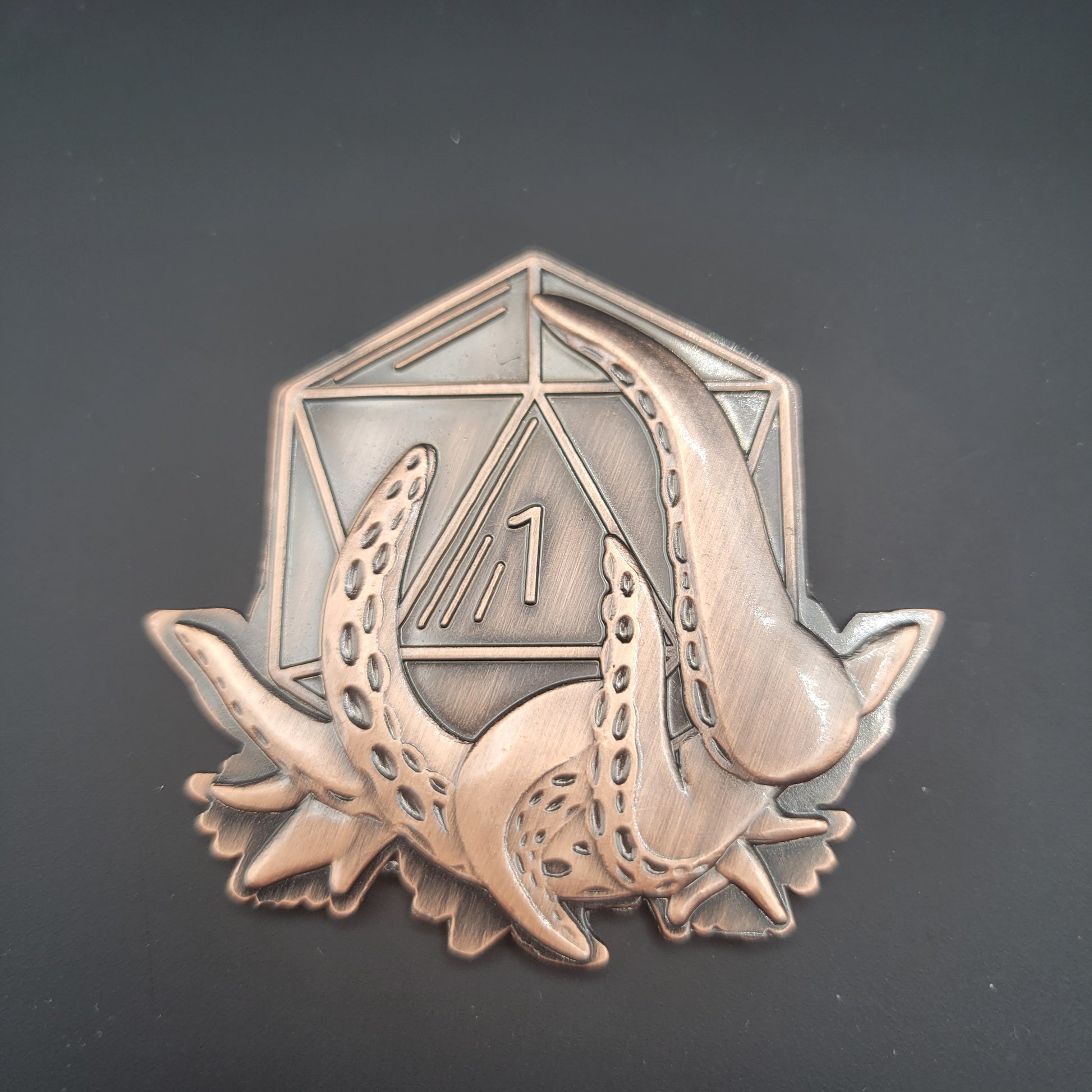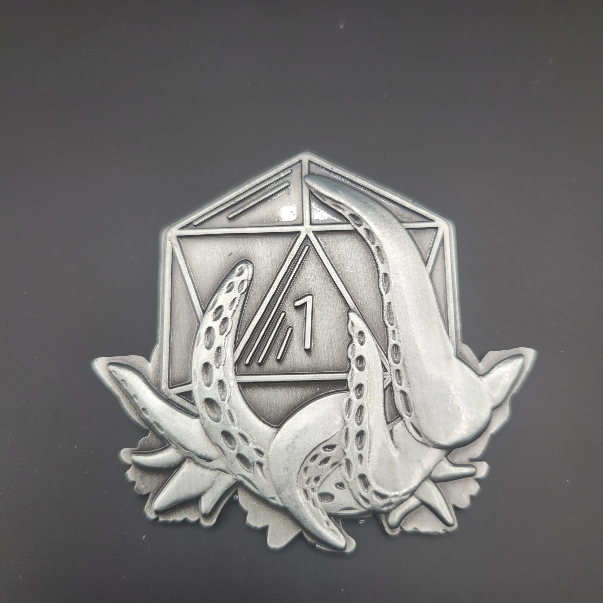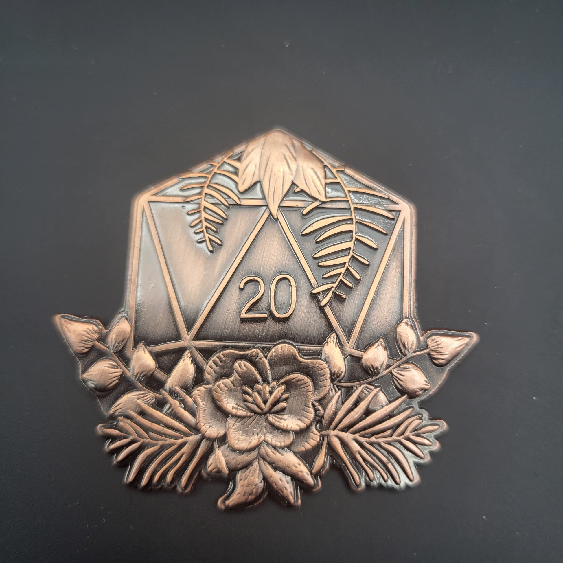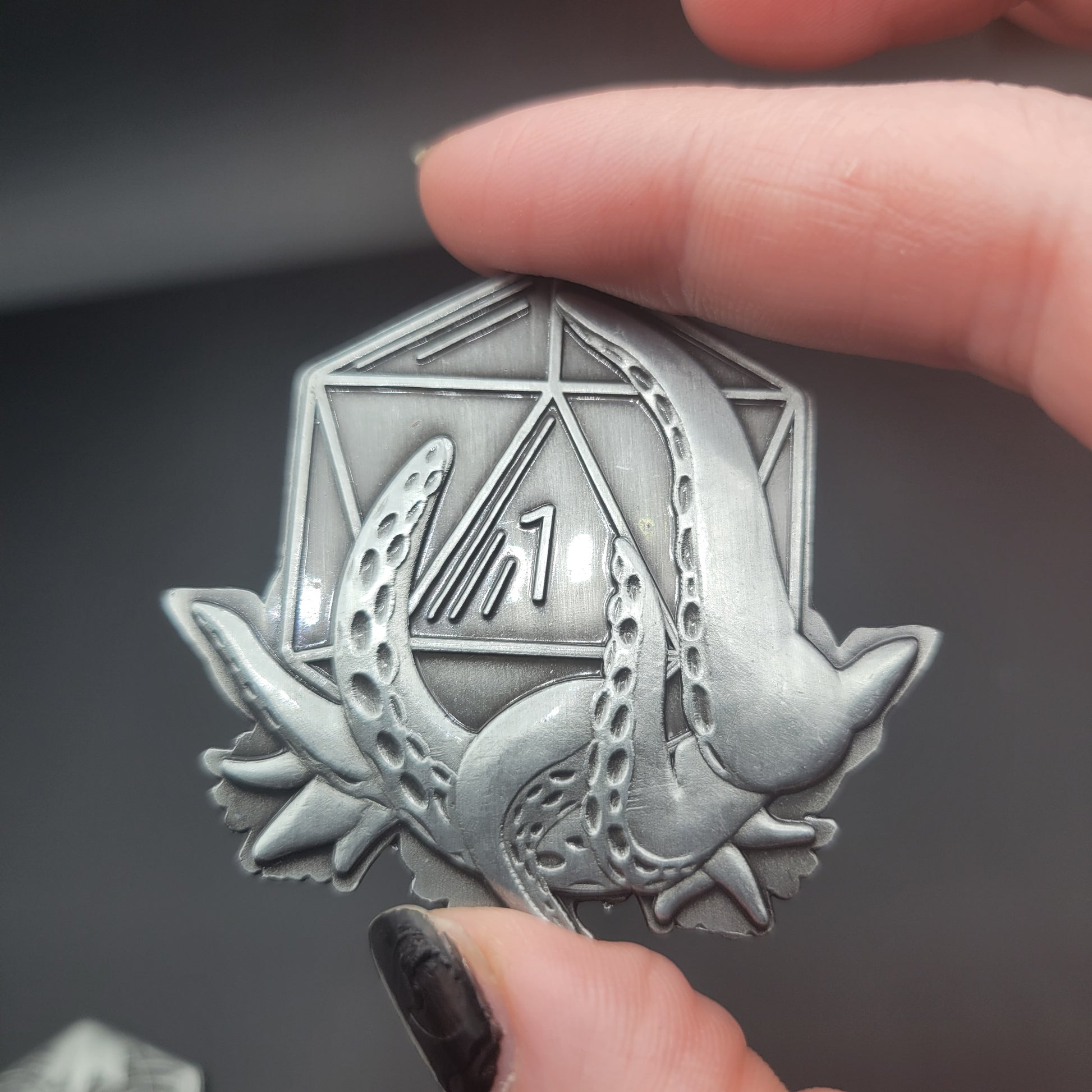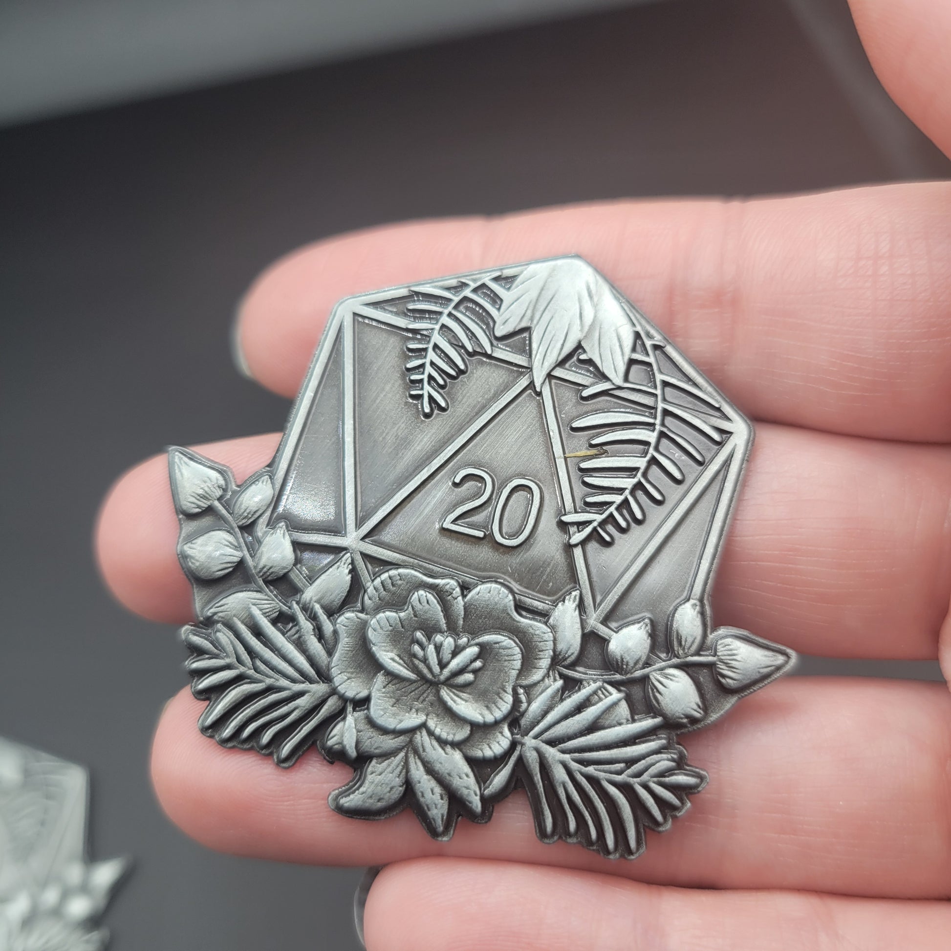 D2 coin Featuring a Floral D20 heads and a Tentacle wrapped D20 tails. Available in an aged bronze or silver look.