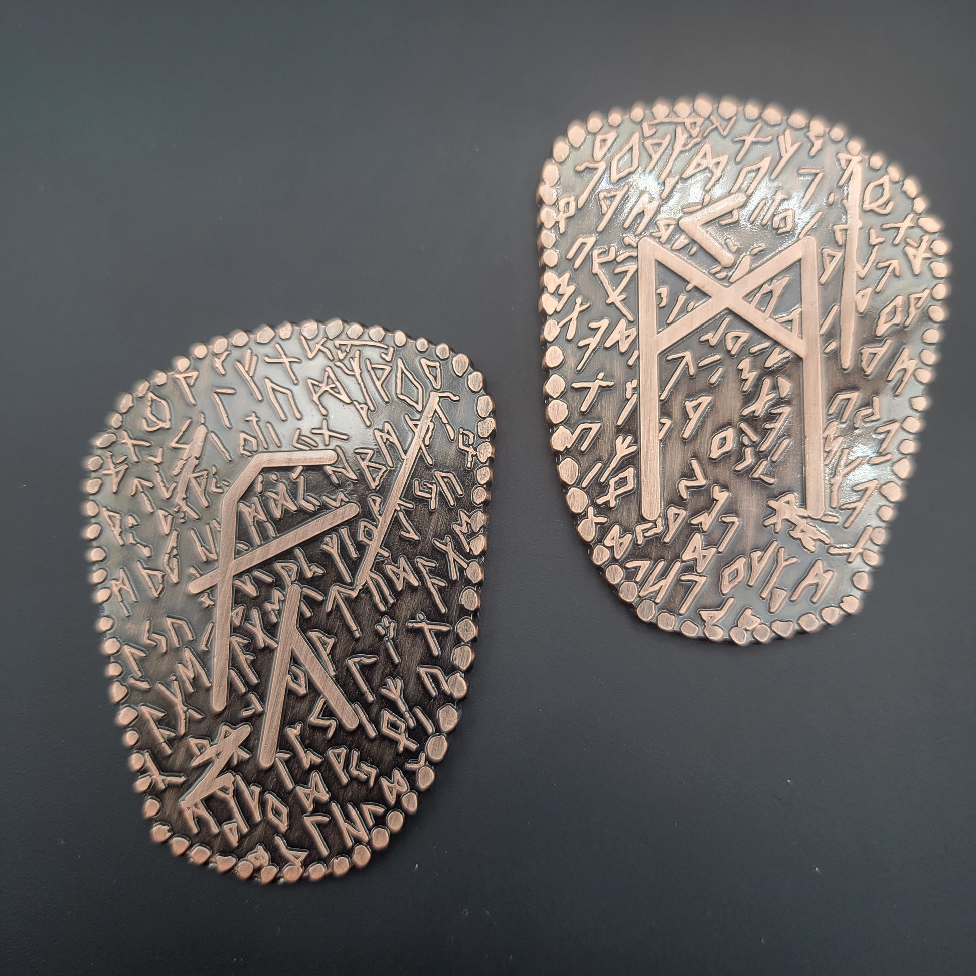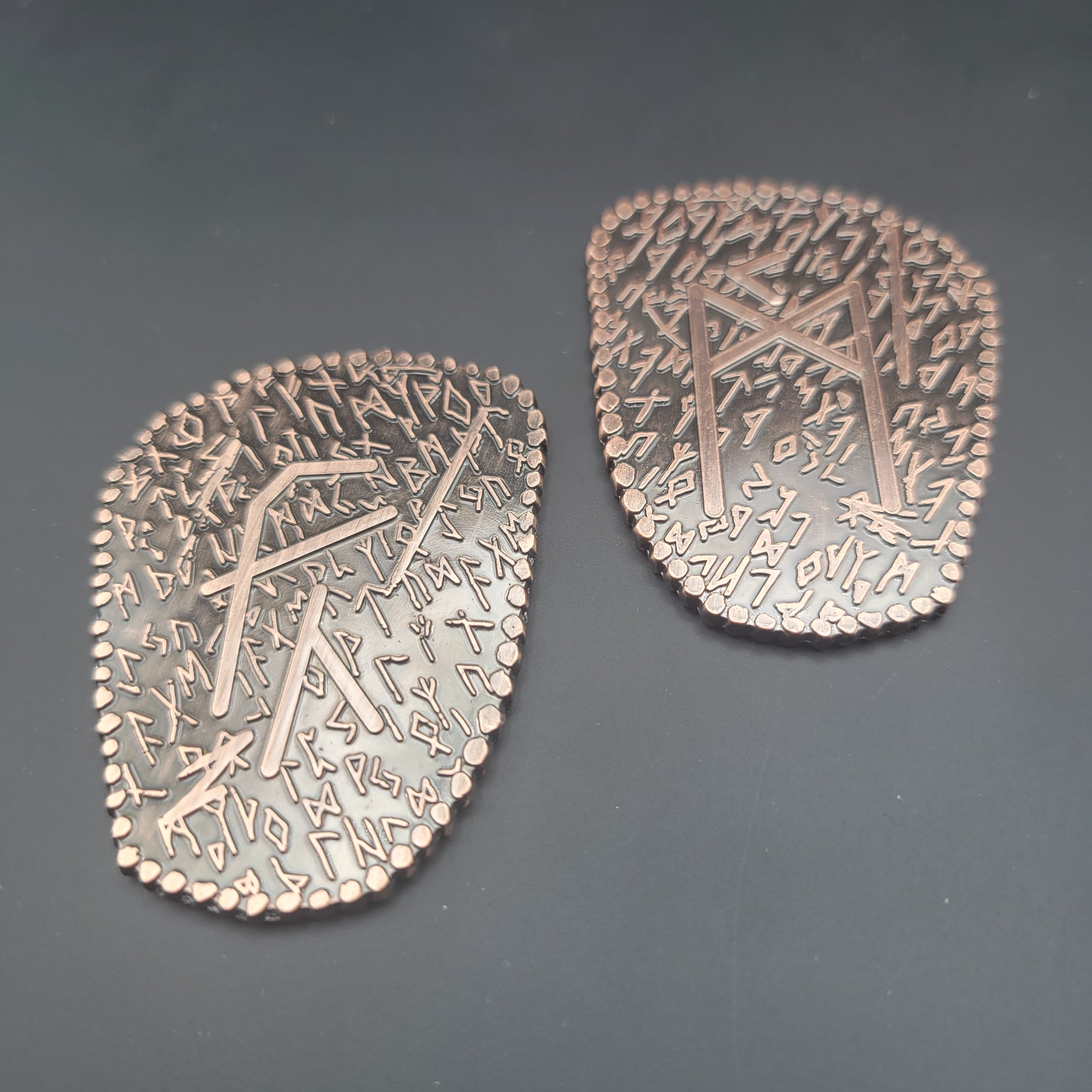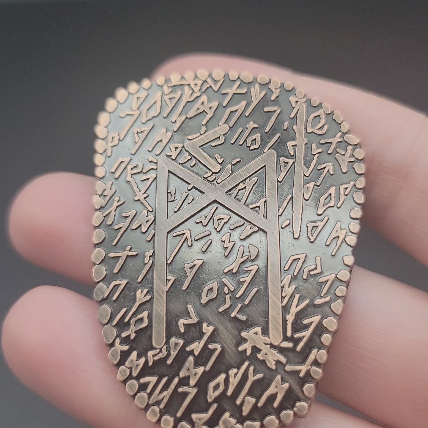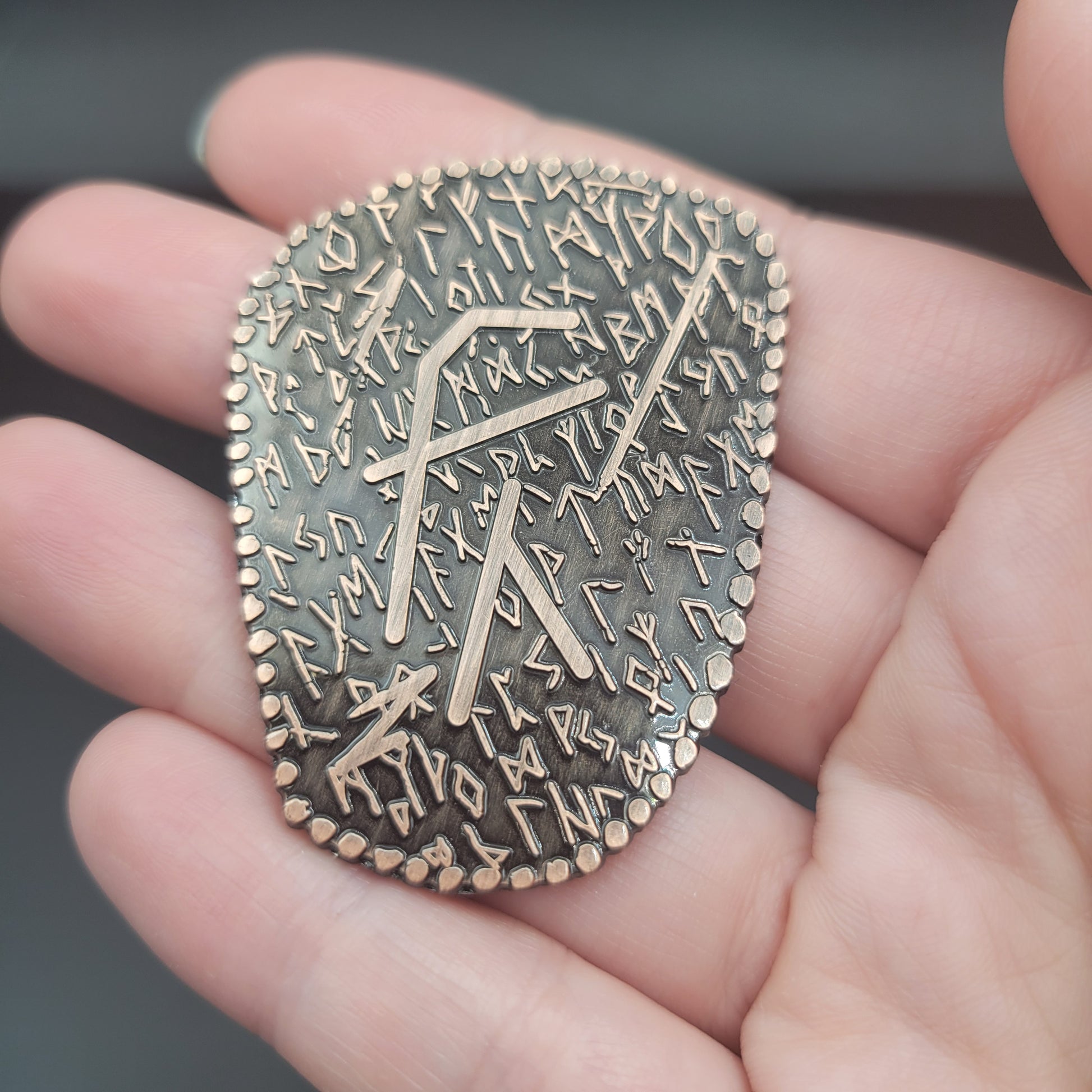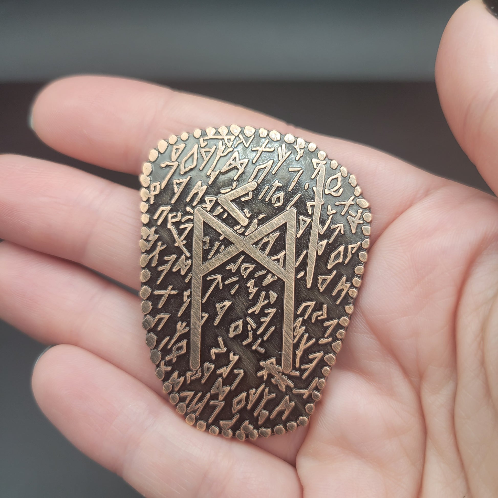 D2 coin Featuring a Norse / Viking Inspired Rune Shape and Design. Available in an aged bronze or silver look.