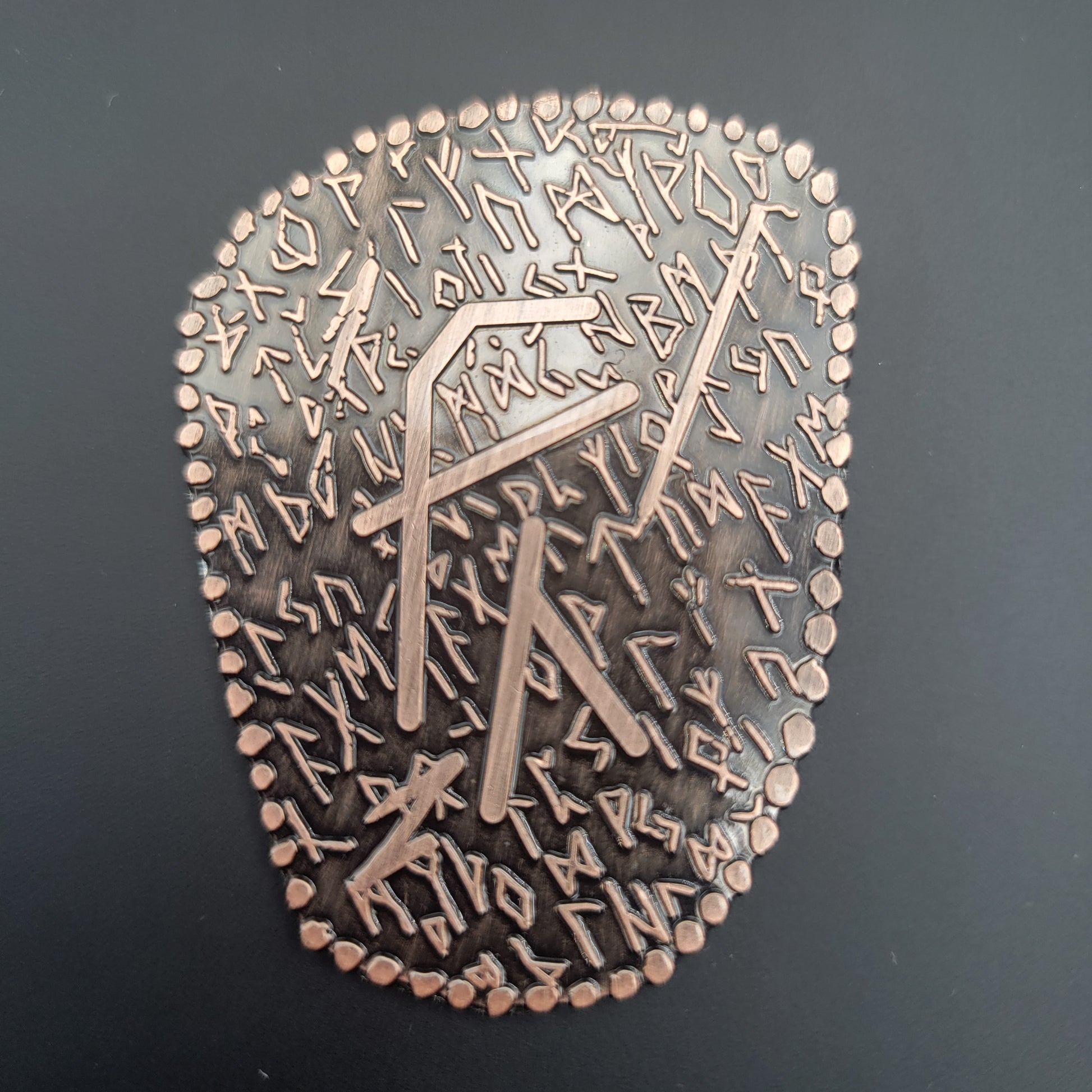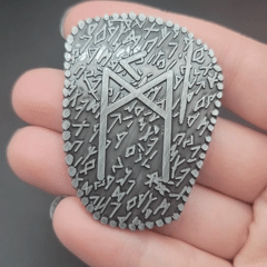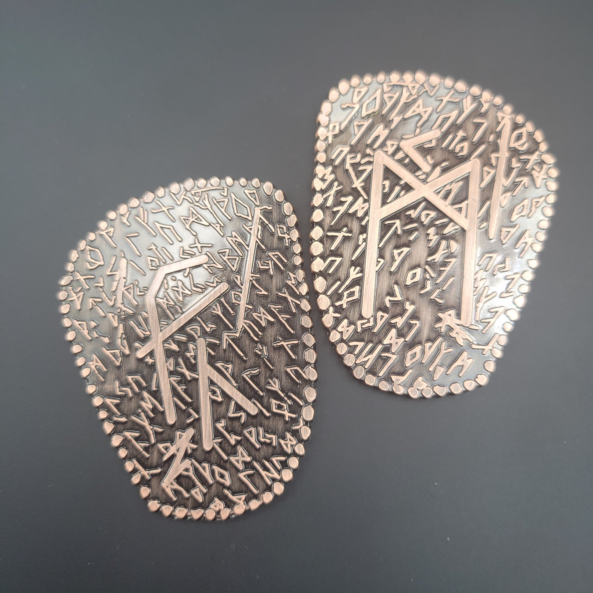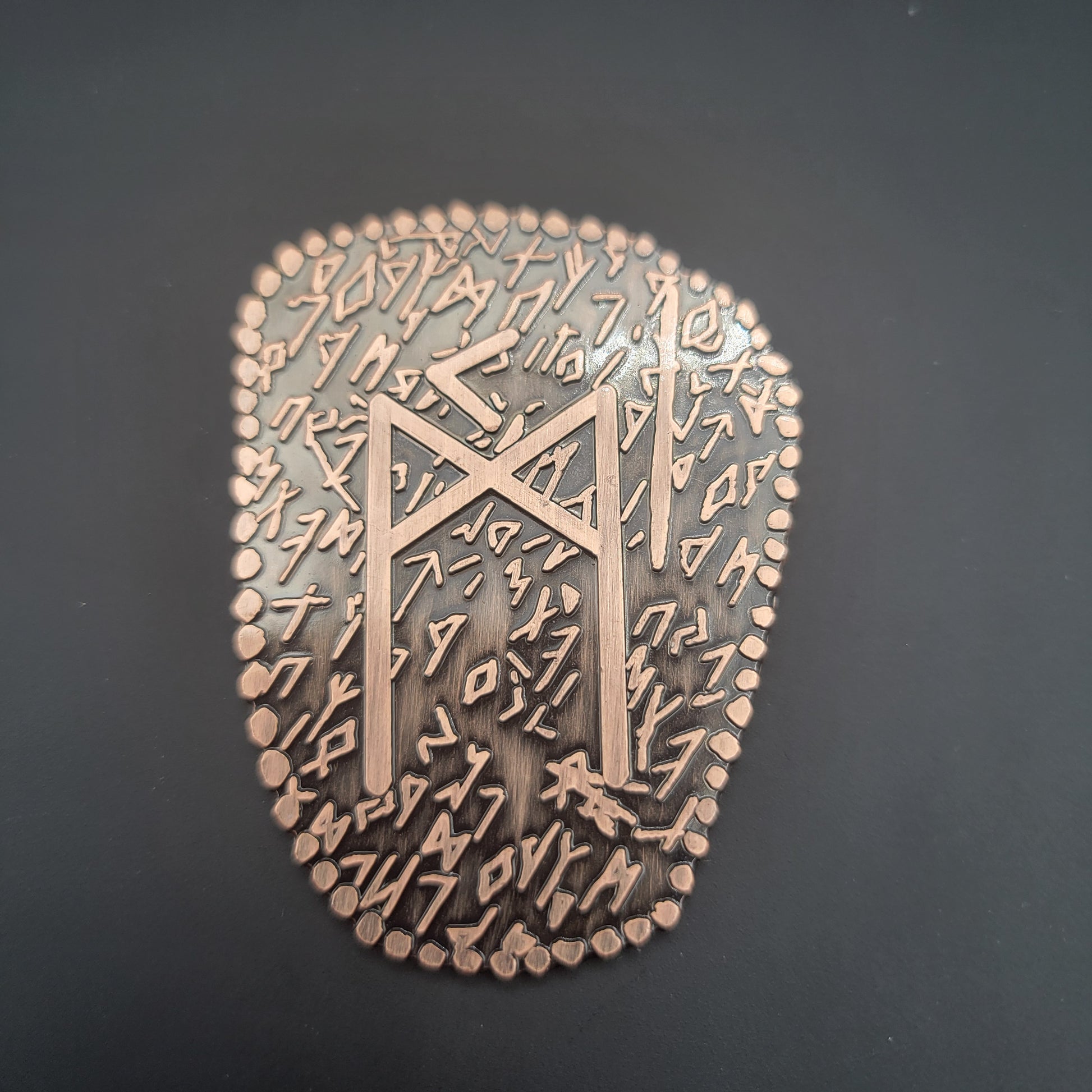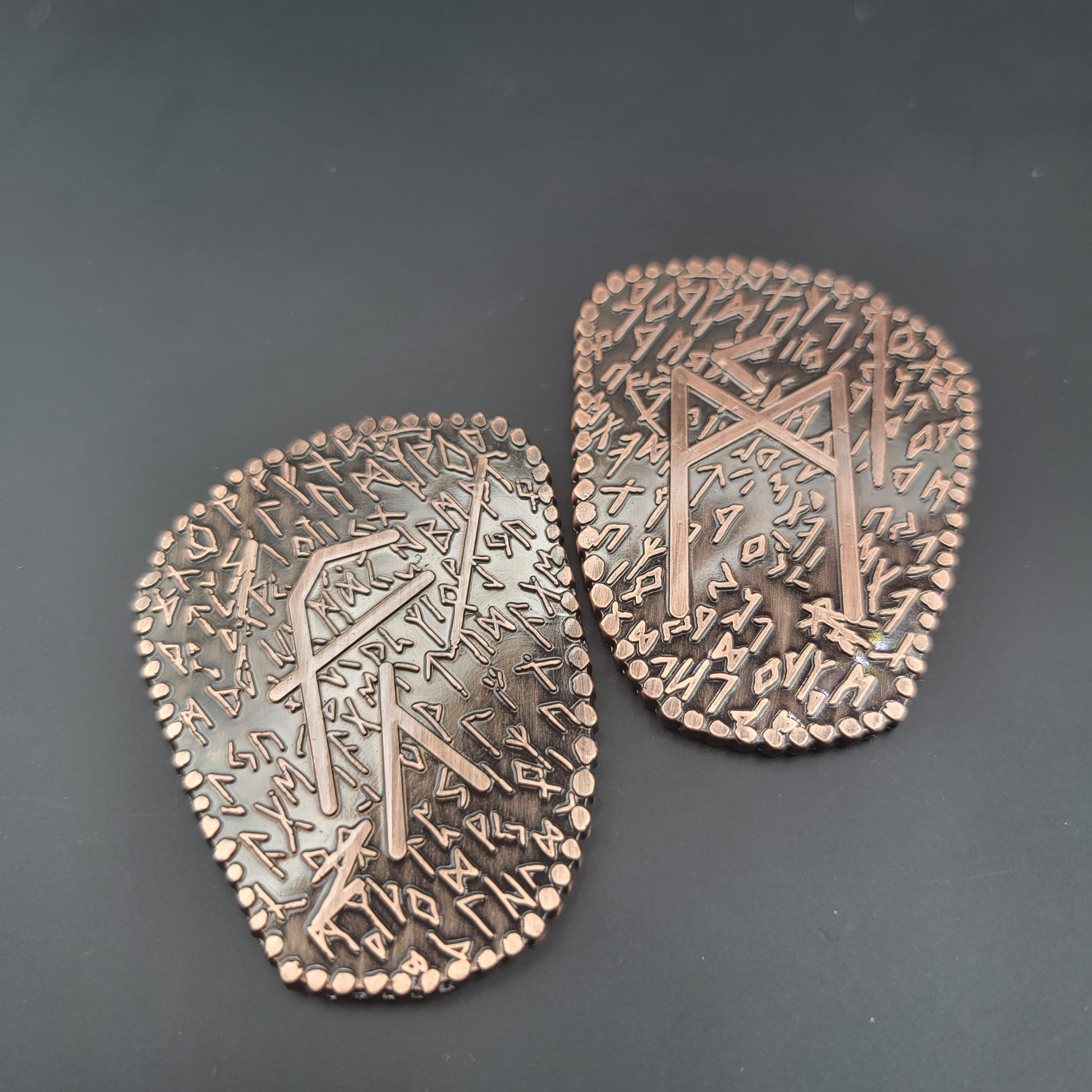 D2 coin Featuring a Norse / Viking Inspired Rune Shape and Design. Available in an aged bronze or silver look.