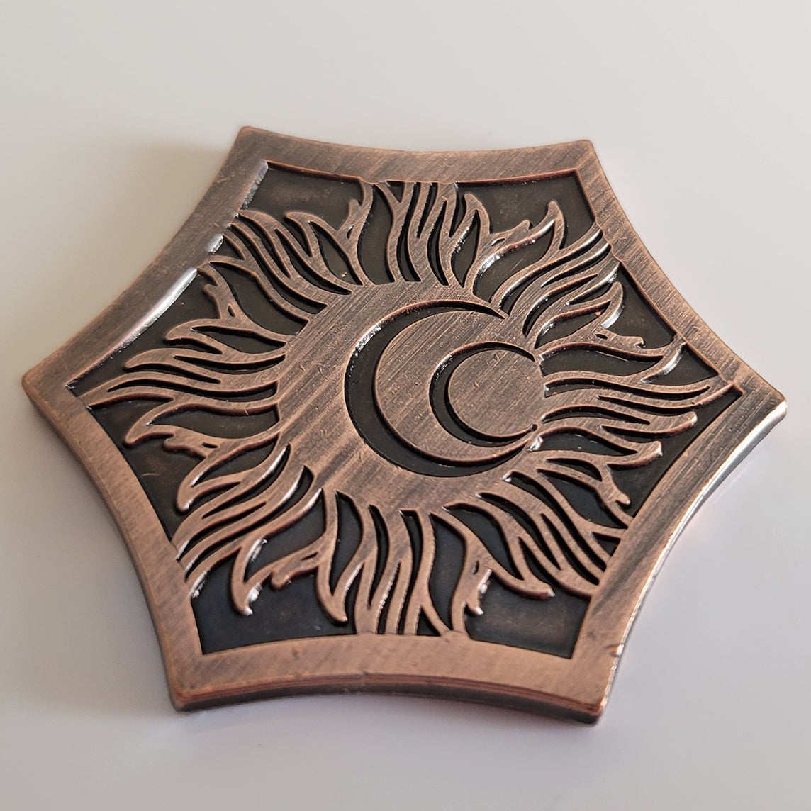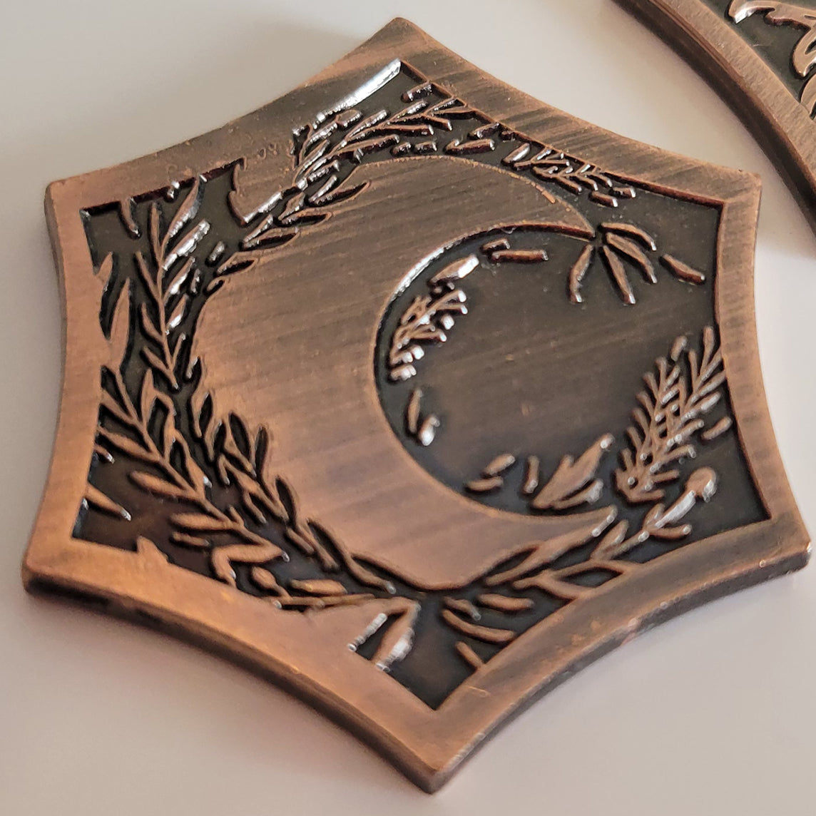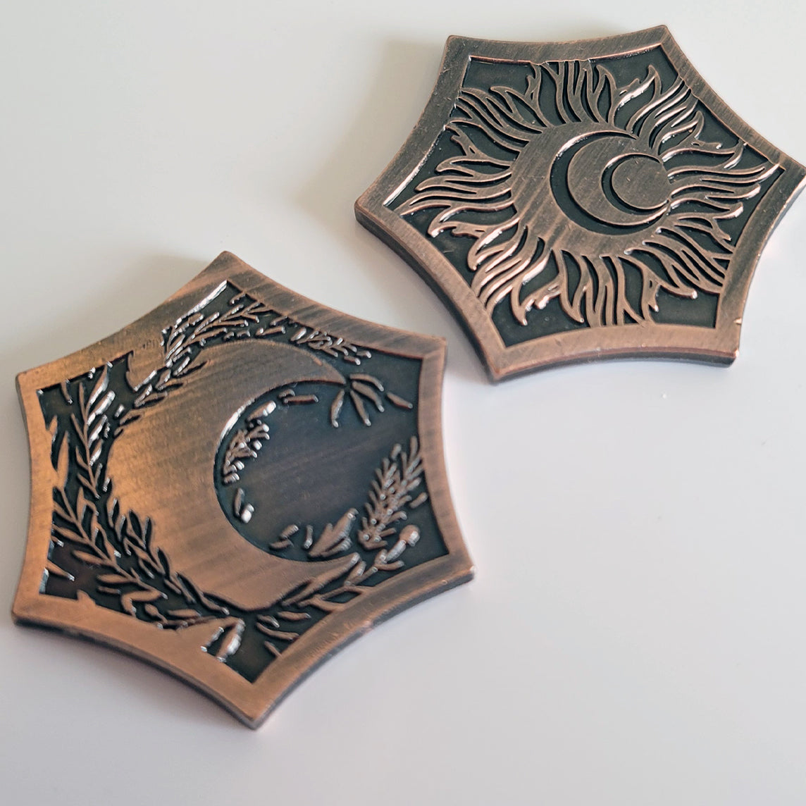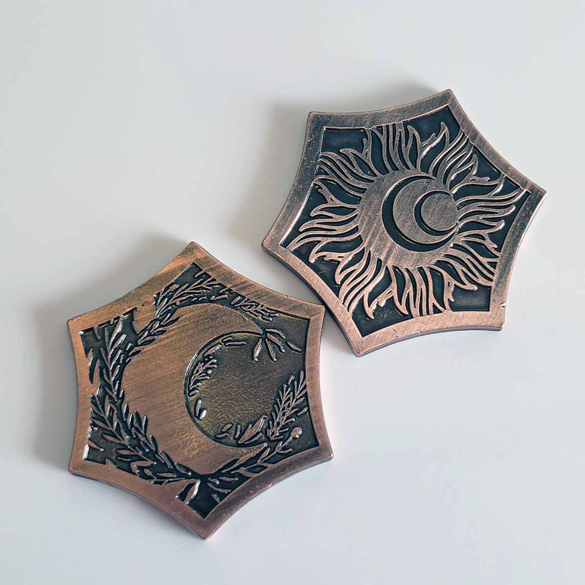 Weathered bronze D2 coin. Featuring a halfmoon on the "heads" side and a magical sun on the "tails" side!