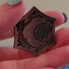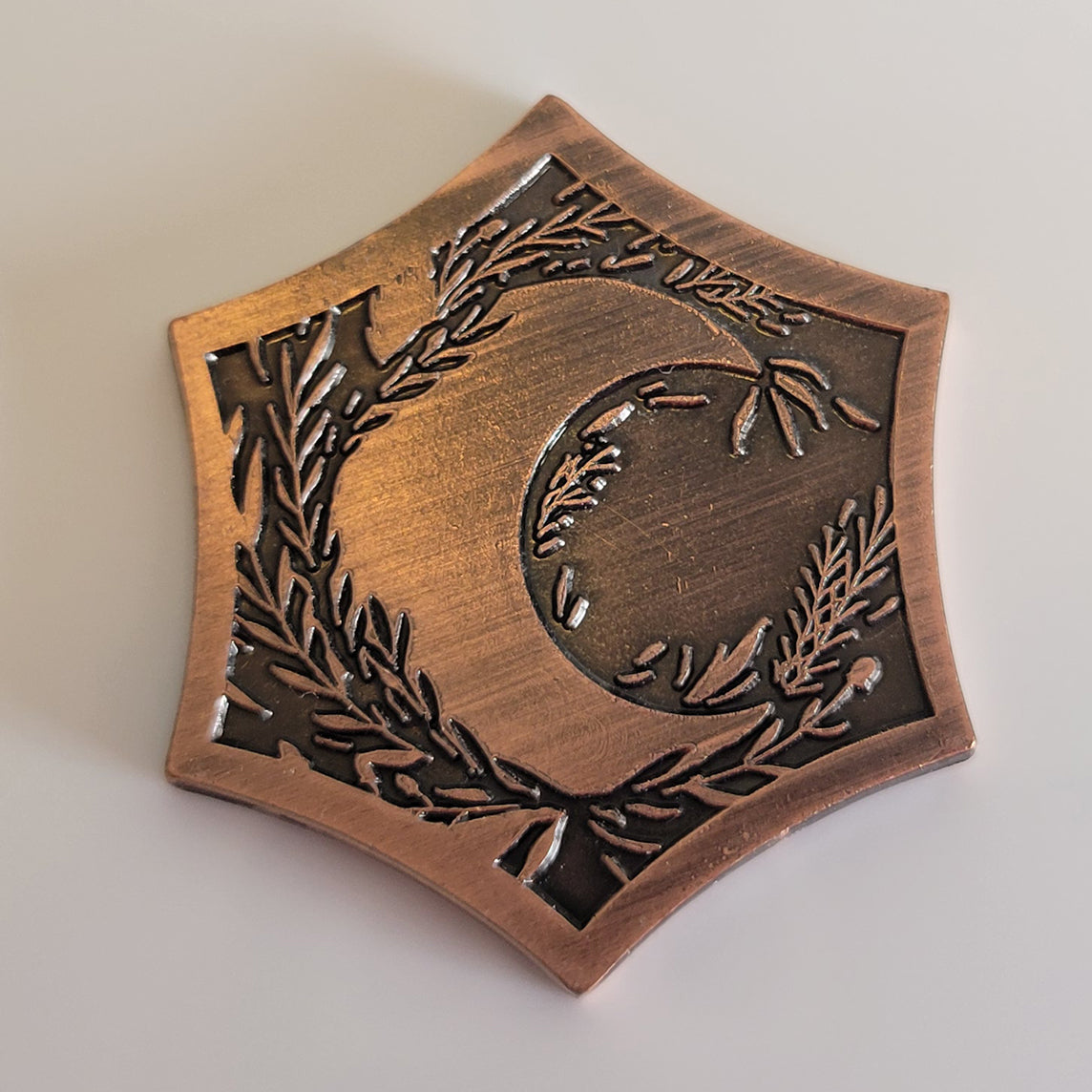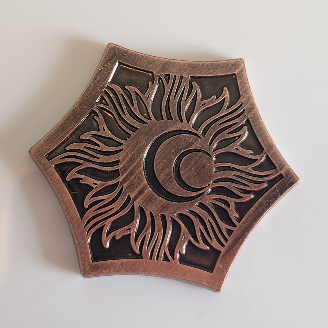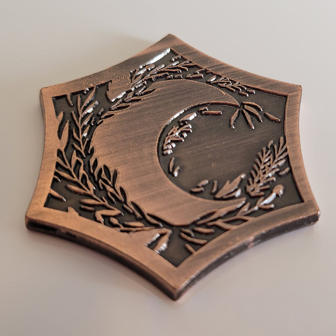 Weathered bronze D2 coin. Featuring a halfmoon on the "heads" side and a magical sun on the "tails" side!