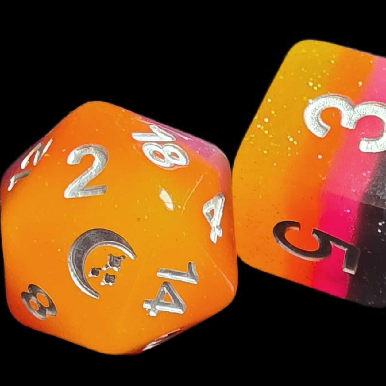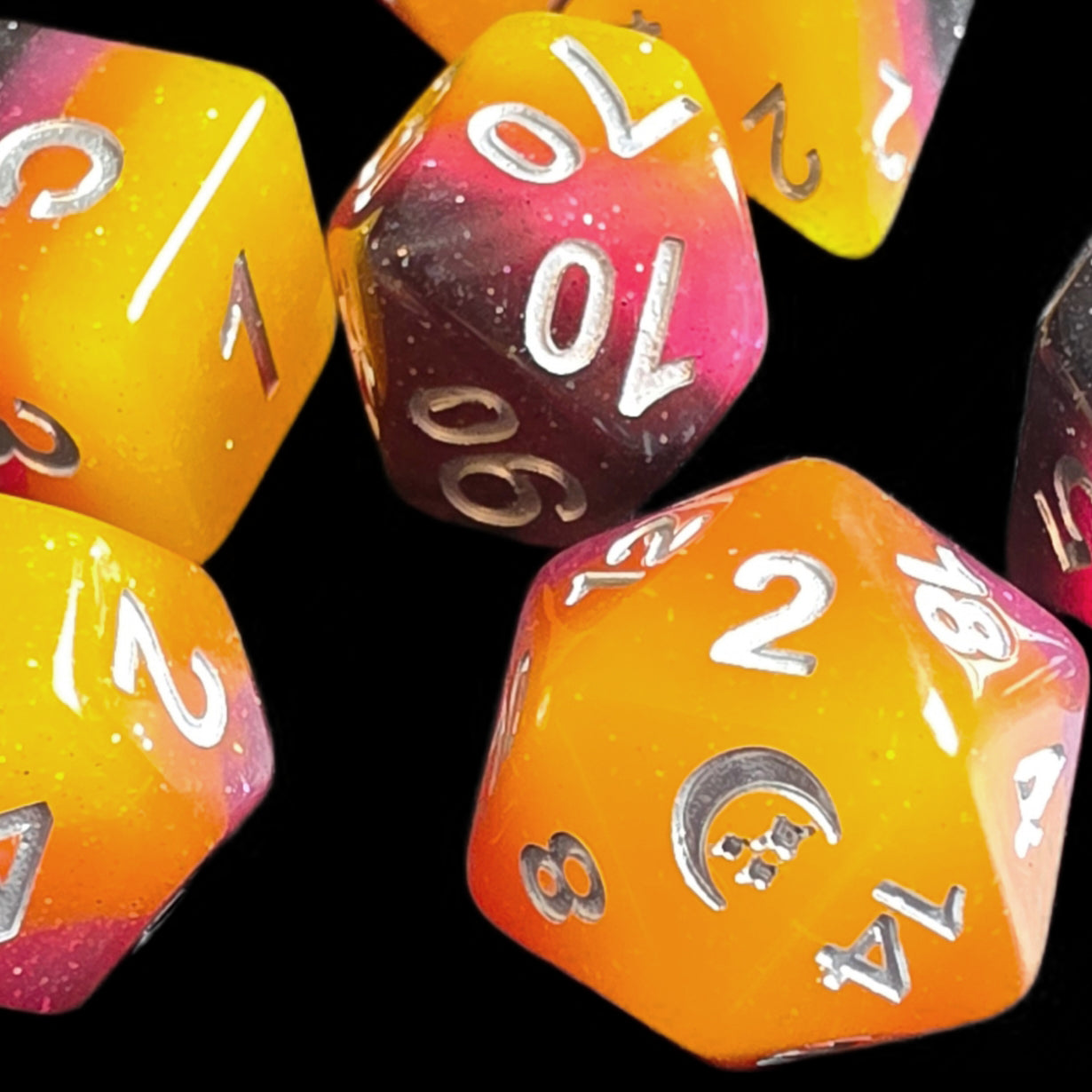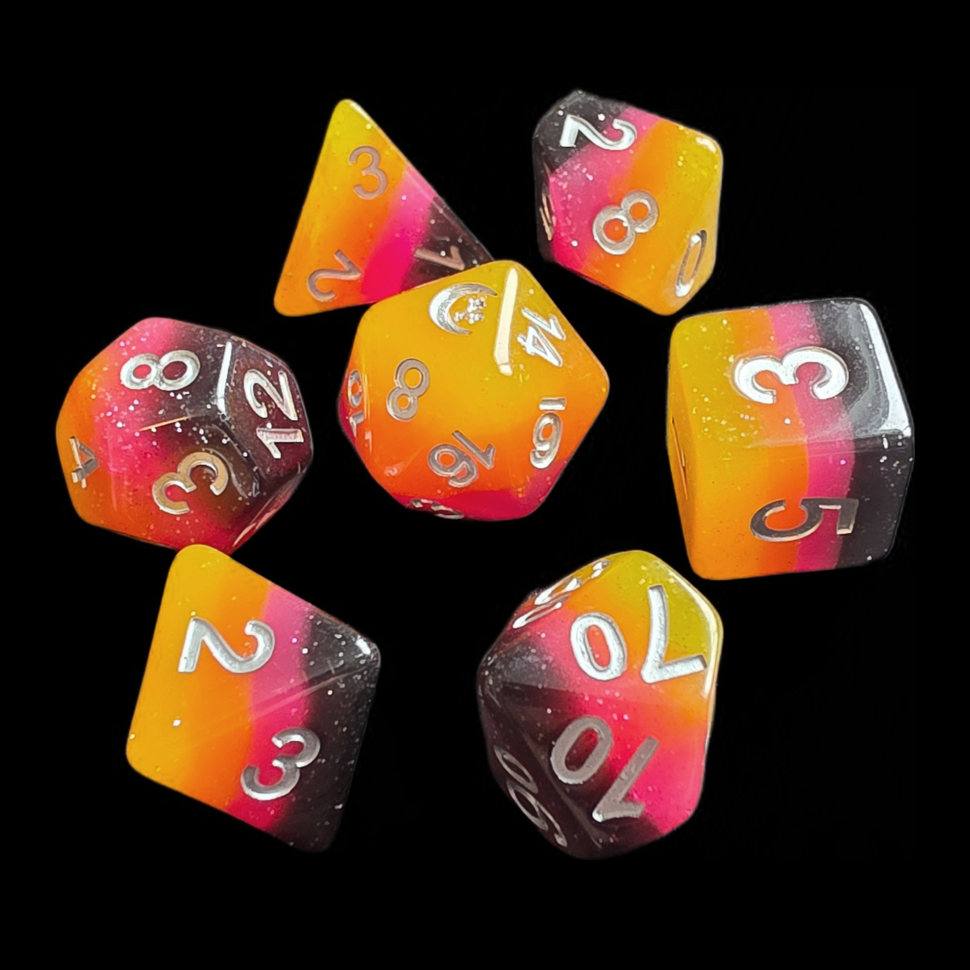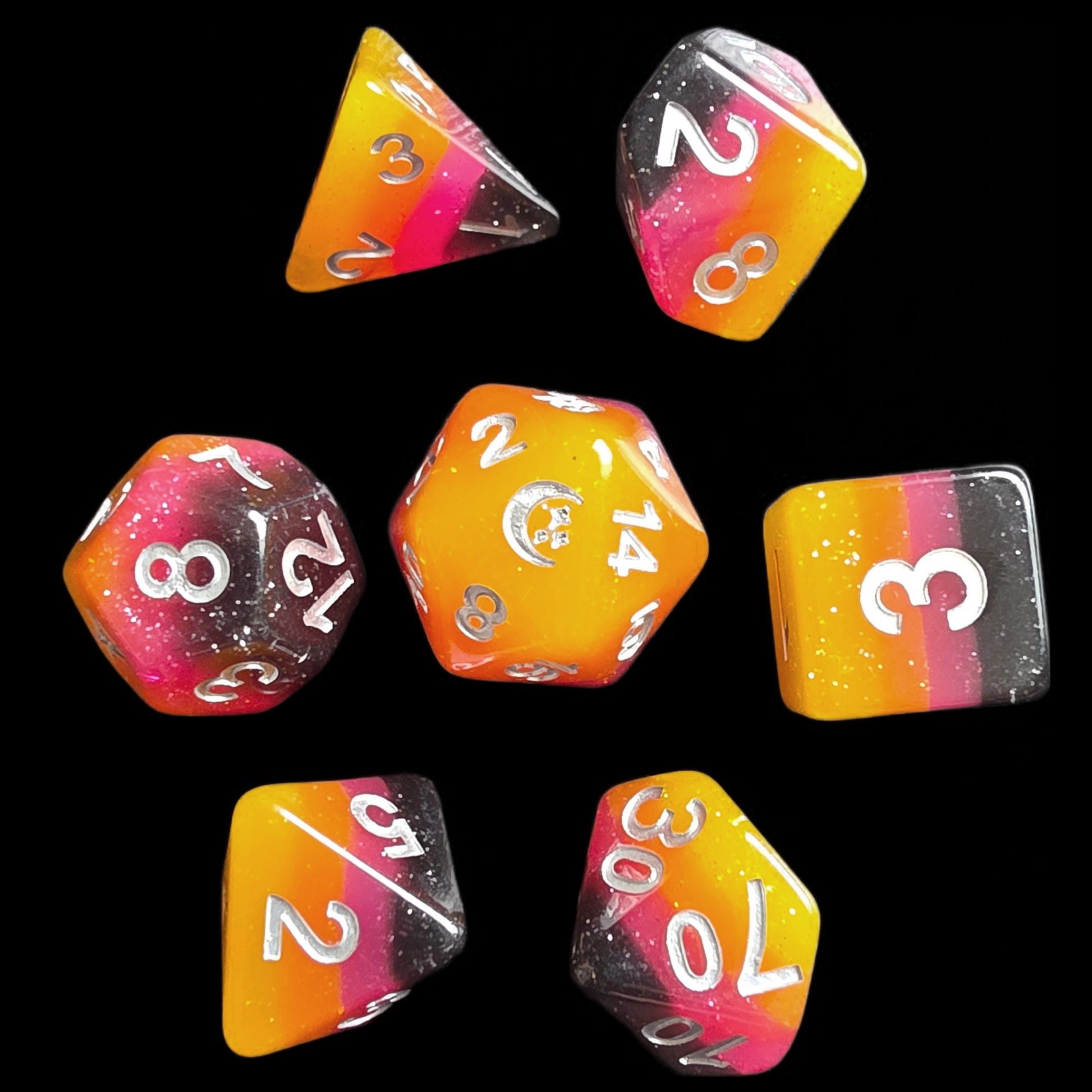 ✦ A sunset captured in dice! Deep purple, pink, orange and yellow layered resin with a gentle sprinkling of glitter.