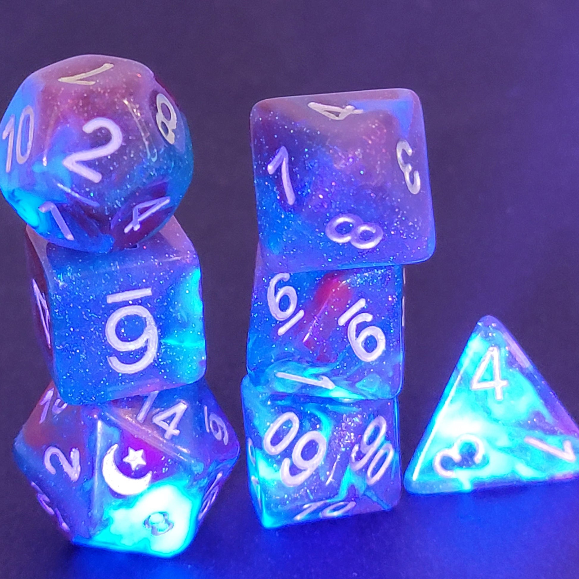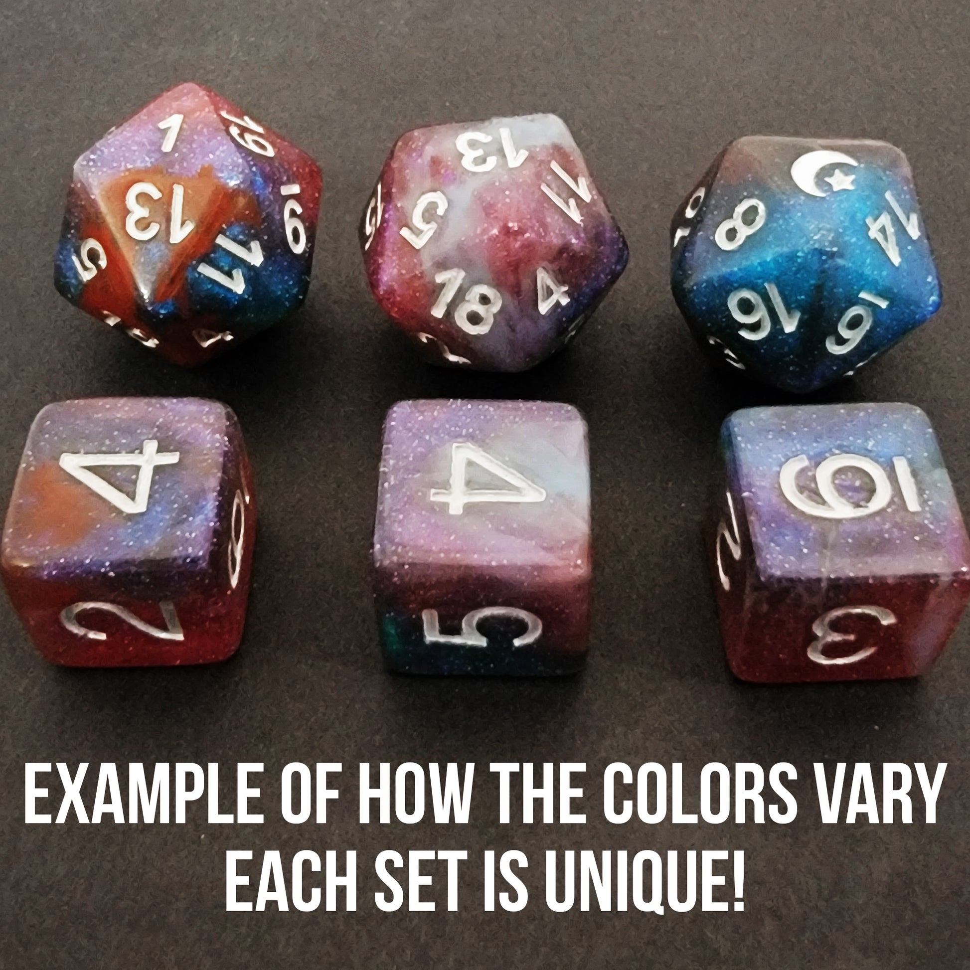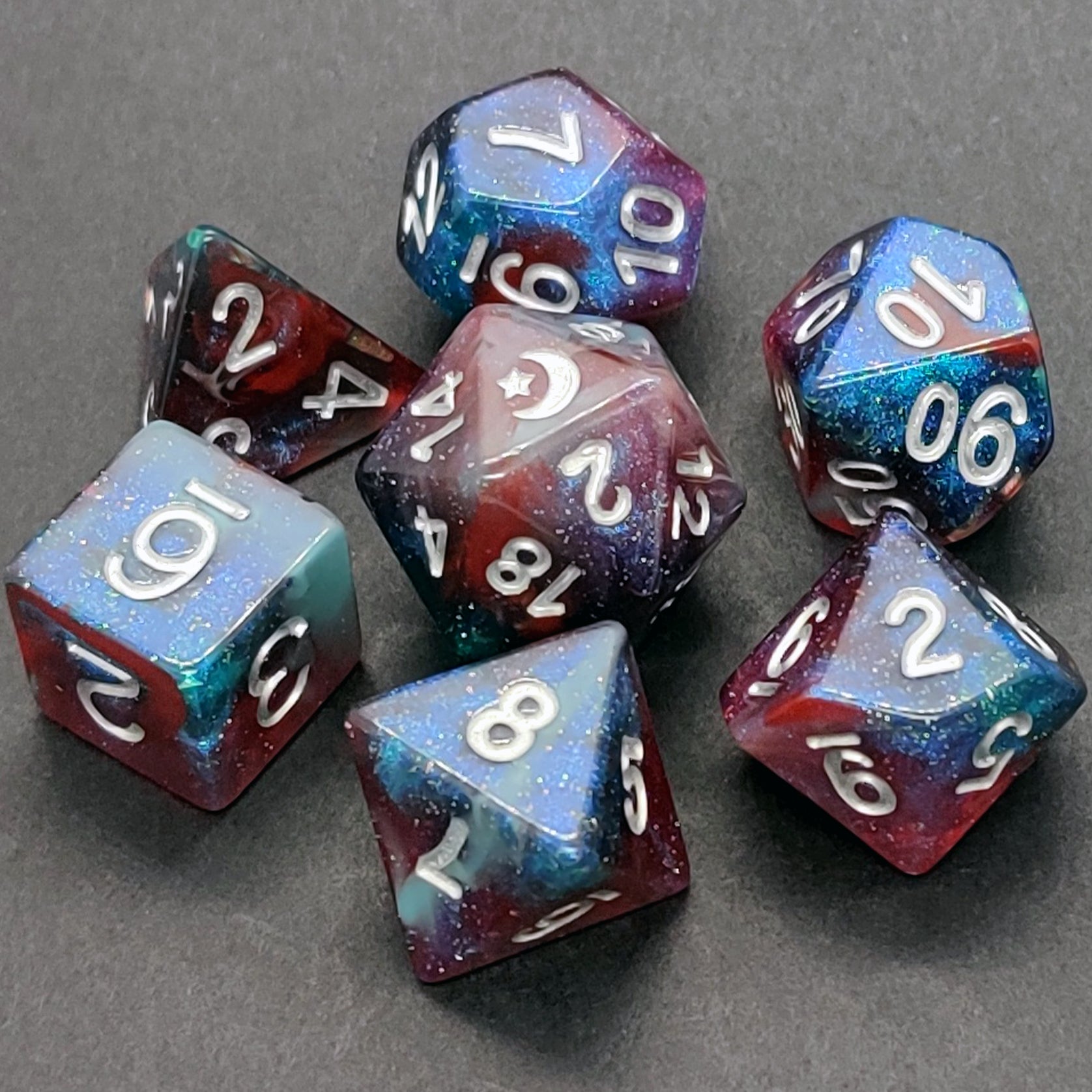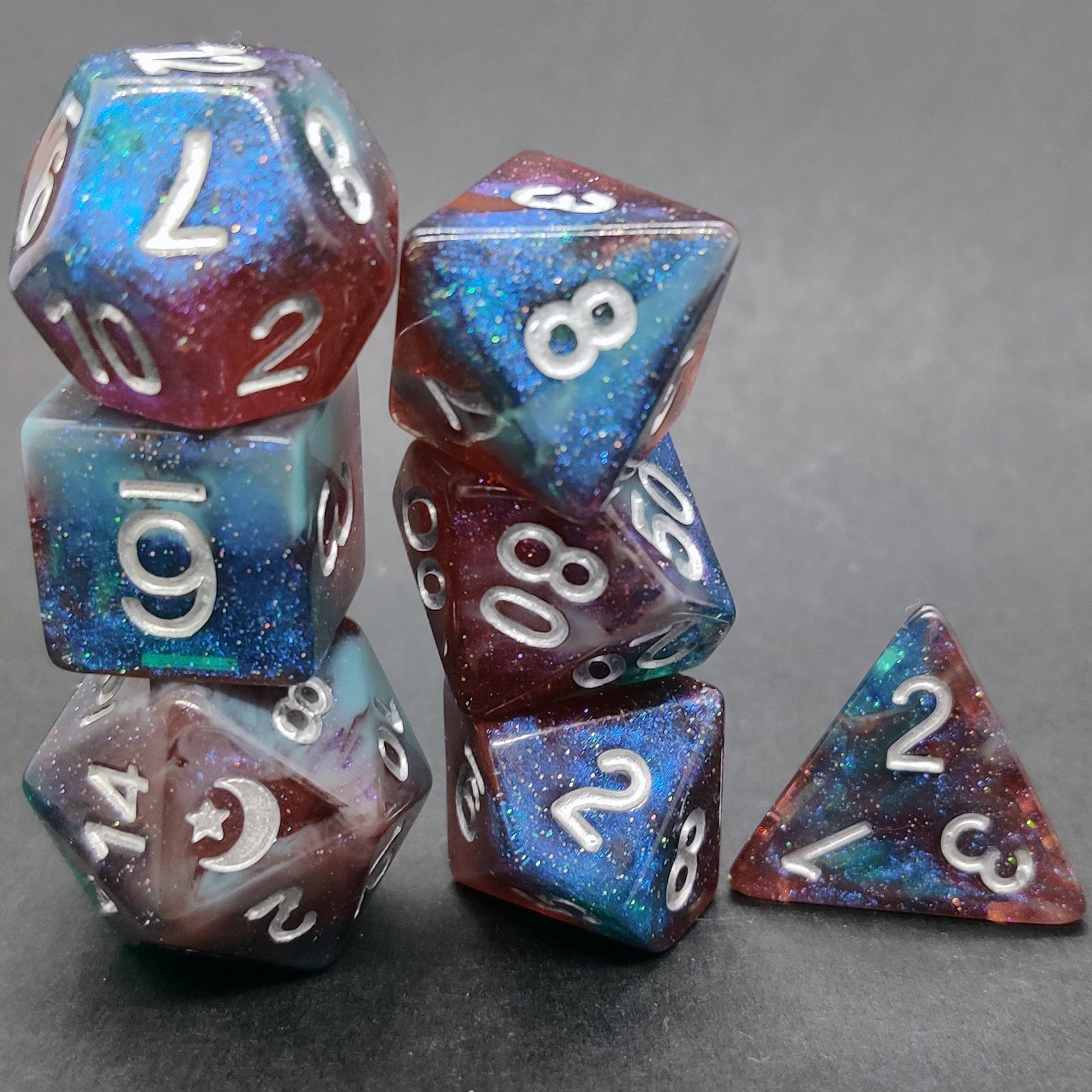 Gorgeous dice! Perfect in every way, cute moon and star on the D20, and they came in a nice bag. Would absolutely order more dice from these guys again