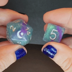 These dice are a lovely blend of opaque pink, teal, and shimmery galaxy black. After getting these dice, now I want more from Dicebound!